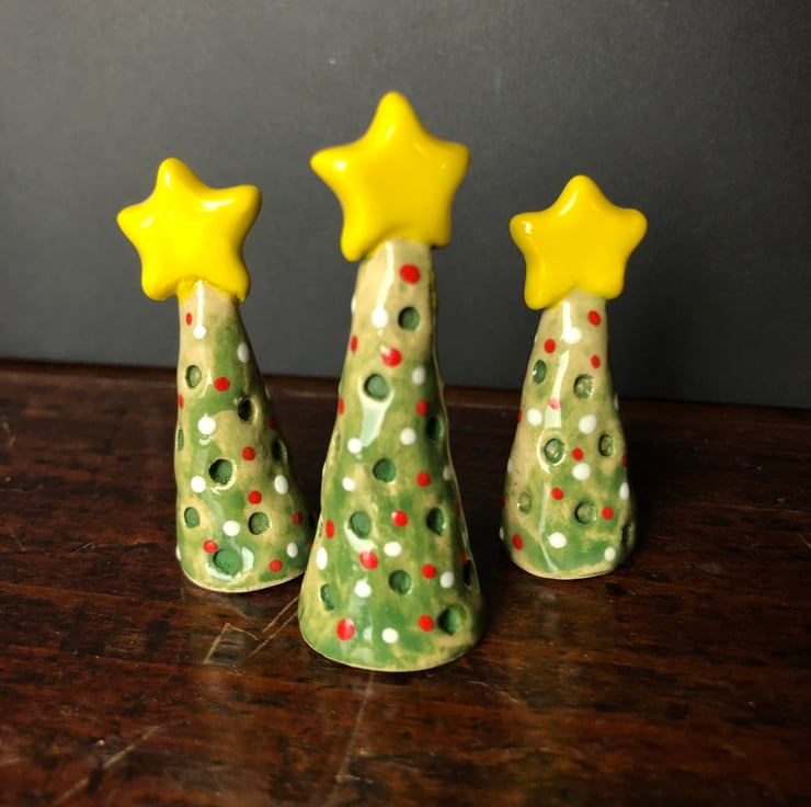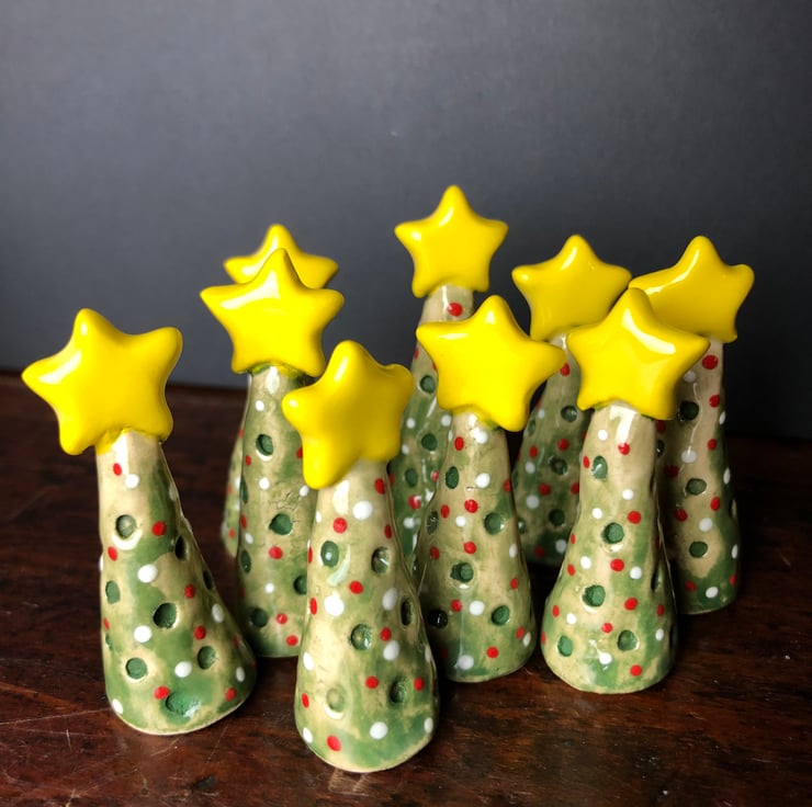 Hand painted ceramic teeny Christmas trees with a star toppers. Stamped with circle shapes which have been hand painted with underglazes before a glossy transparent glaze has been applied and fired for a second time.