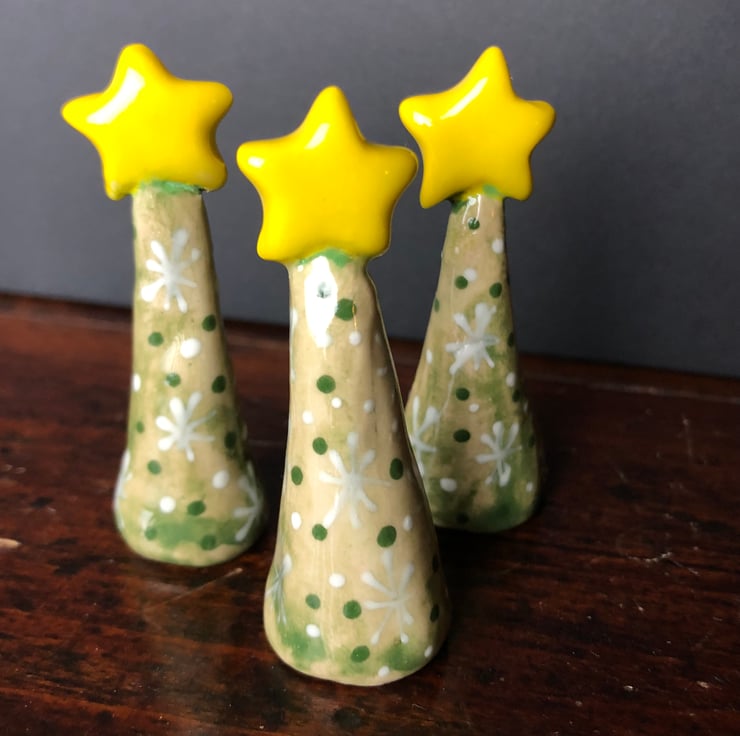 Hand painted ceramic teeny Christmas trees with a star toppers. Hand painted with underglazes before a glossy transparent glaze has been applied and fired for a second time.