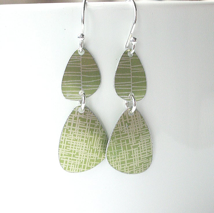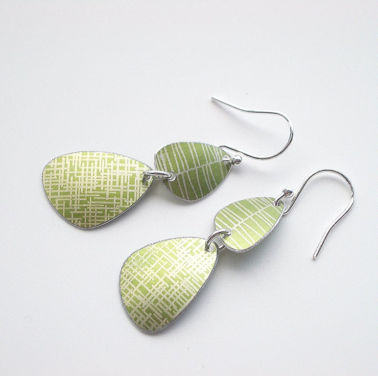 These mid century inspired earrings are made from anodised aluminium which I have dyed in lime green and printed with a tree and cross hatch design. I cut the pebble shapes by hand using a jeweller’s saw and file the edges to give a nice smooth finish. Finally I dome the pebble shapes so that they catch the light.