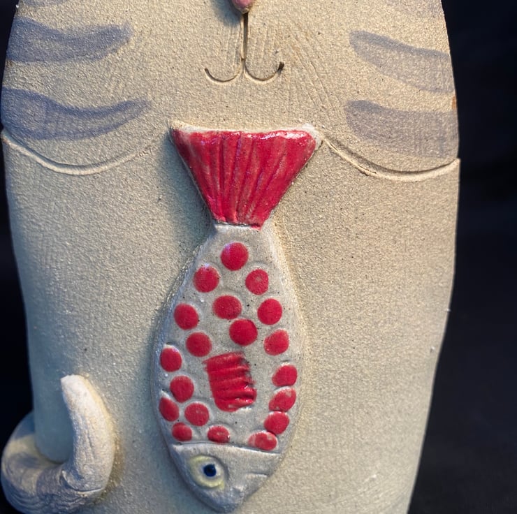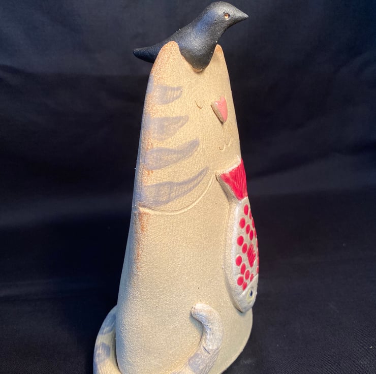 Dressed smartly in his grey striped suit and kipper tie, this cat is happy to stay inside in the warm with you or sit outside in the garden all year round, perhaps perched next to the garden pond if you have one to keep an eye on the fish for you.