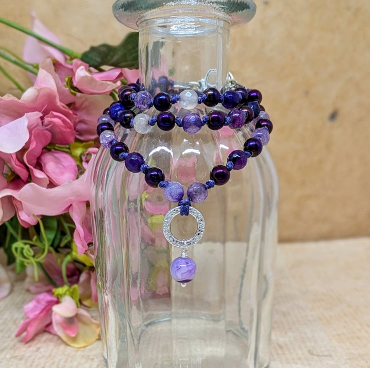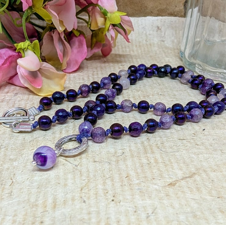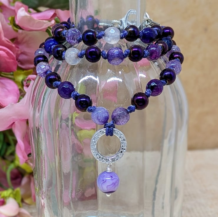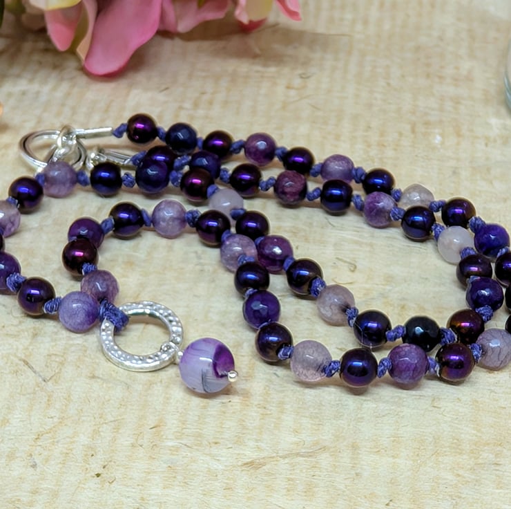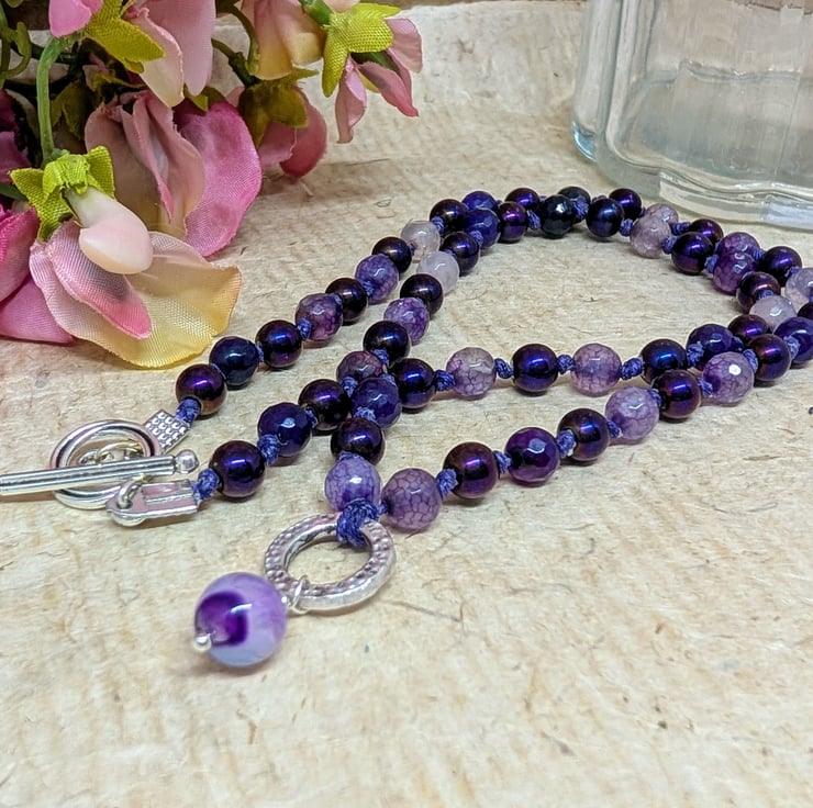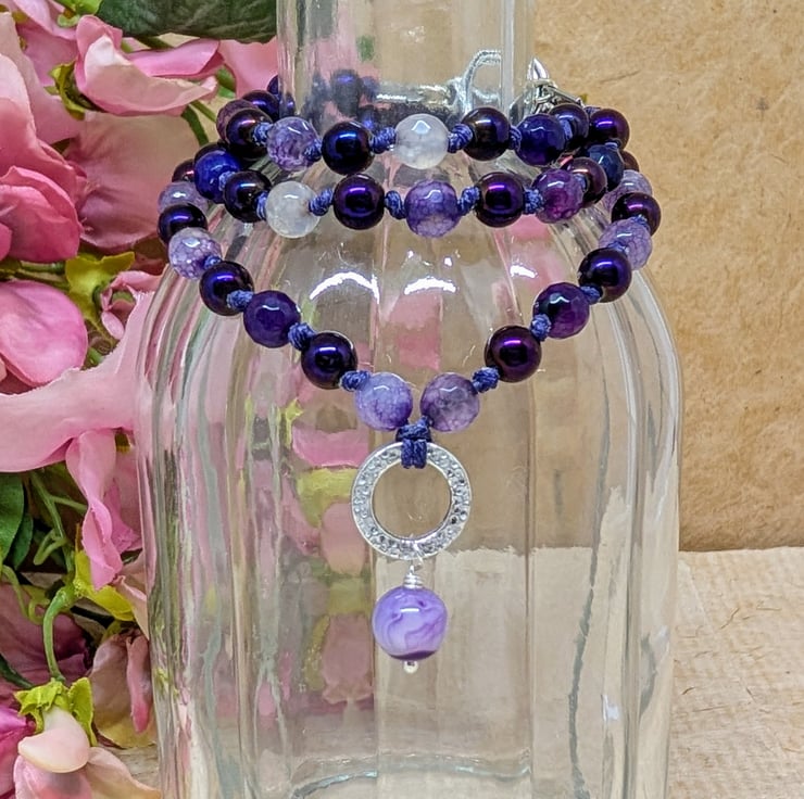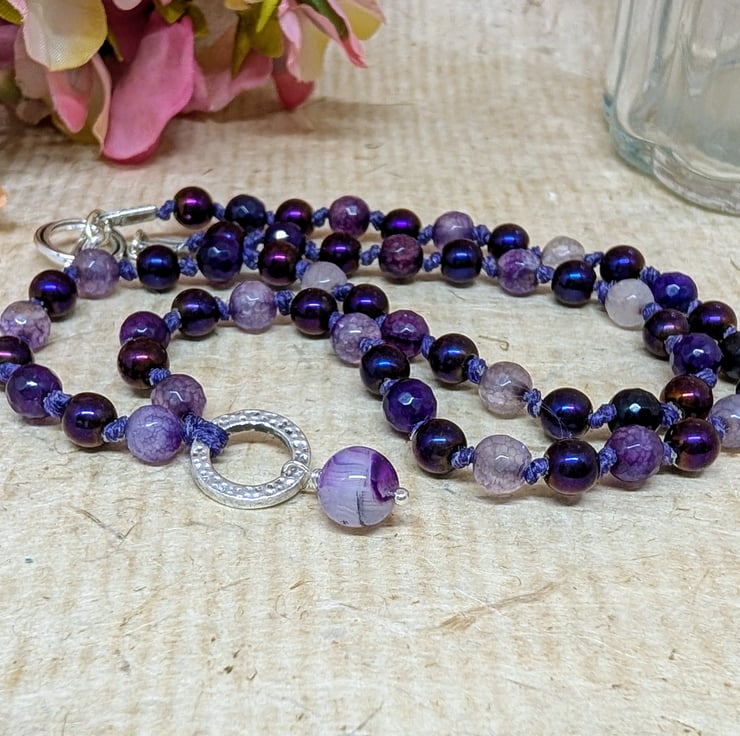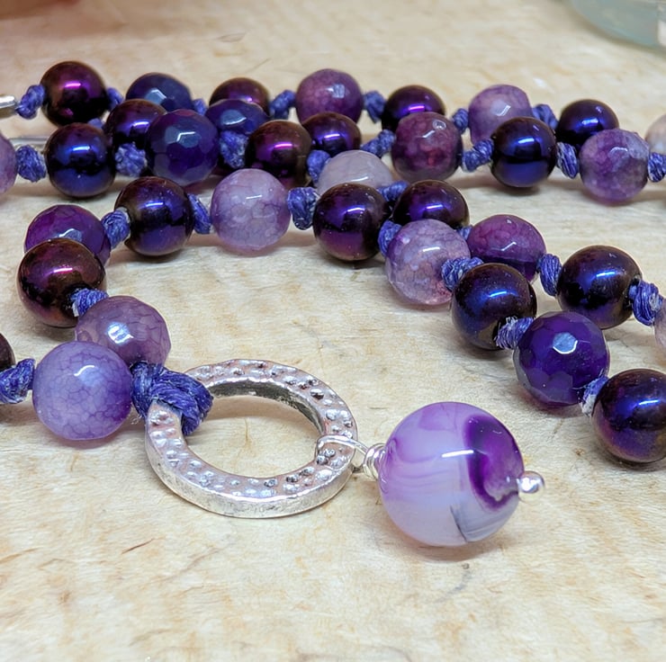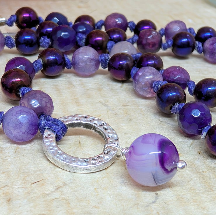 The focal point is a silver coloured ring with a single larger agate bead beneath it. Everything has been knotted onto purple linen cord. It measures just over 19" or 49cm in length and fastens with a toggle clasp.