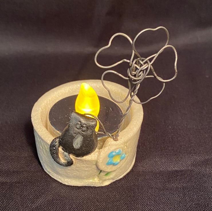 Lightly embossed candle holder with cat and twisted wire flower. Holds standard size tea light.
