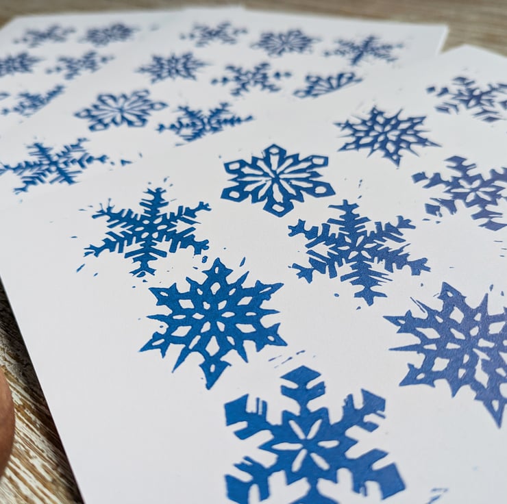 This is an original linocut Christmas card showing twelve icy dark blue snowflakes. There are four different snowflake patterns, each repeated three times within the overall design, but each snowflake is slightly different due to the nature of hand carving!