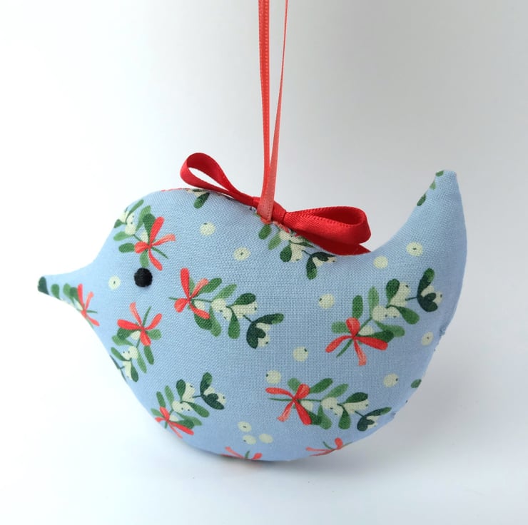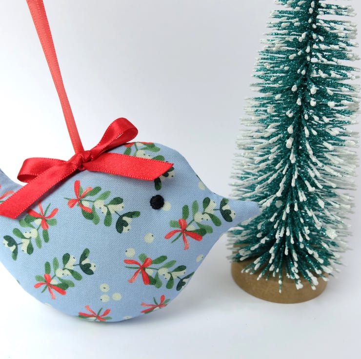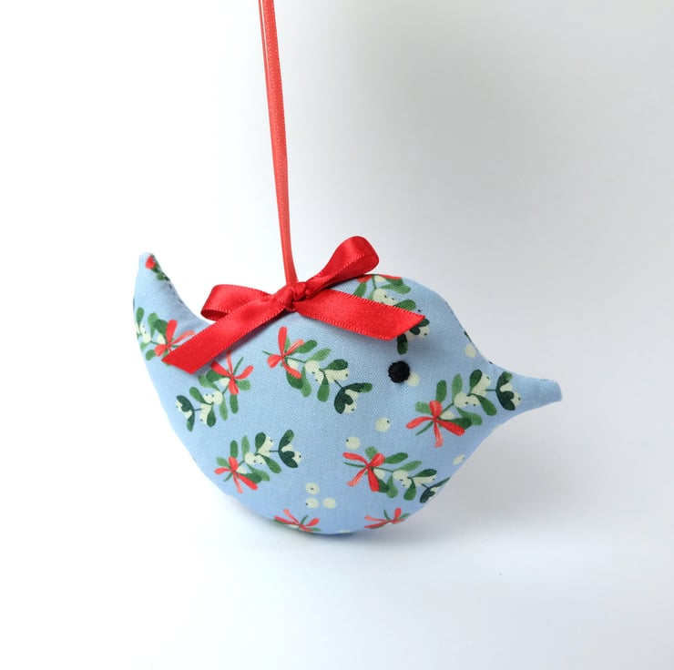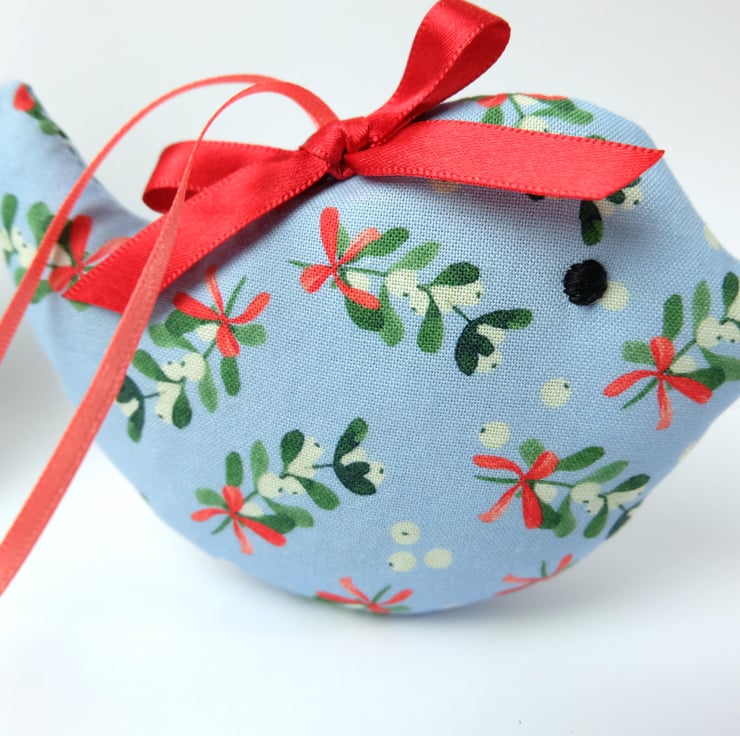 A Christmas mini bird lavender sachet, in pretty blue mistletoe cotton fabric. It is filled with deliciously scented lavender flowers and is designed to hang in your wardrobe to scent and freshen clothes. The bird may also be hung on a bed post or door hook as a pretty decoration. These little birds make lovely little gifts and stocking fillers!
