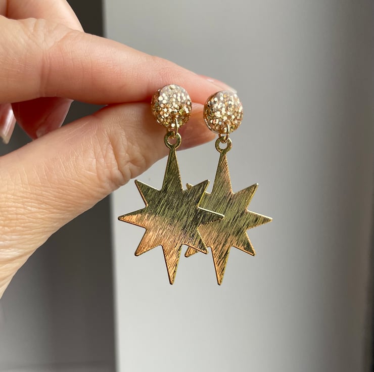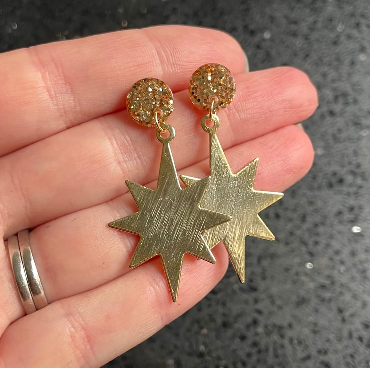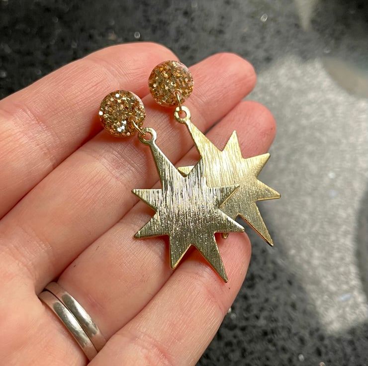Statement dangles made with textured brass star charms on gold glitter studs.