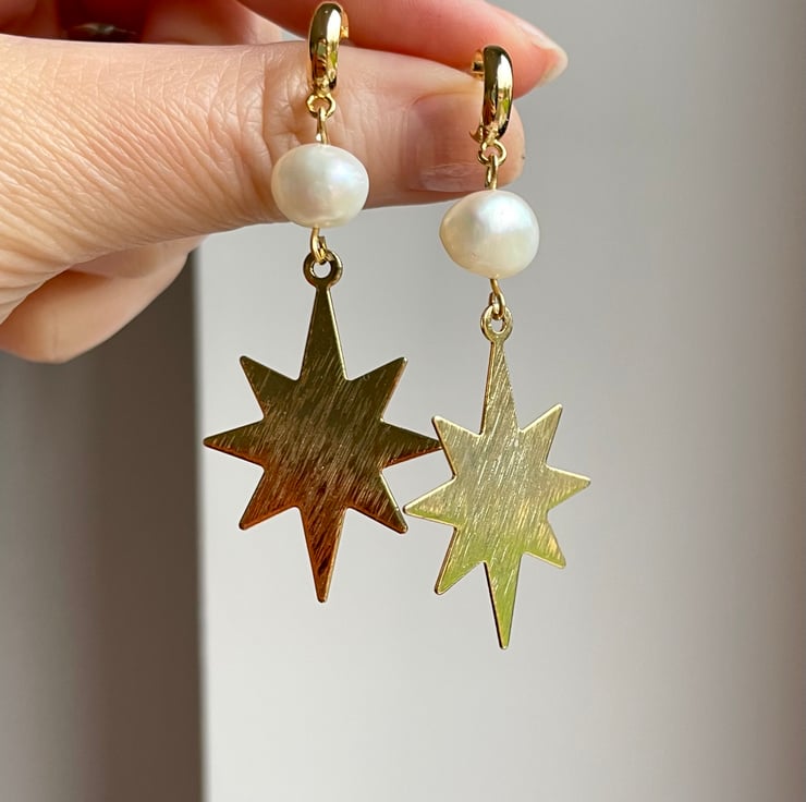 Statement dangles made with textured brass star charms on gold-plated huggie hoops, with an irregular freshwater pearl.