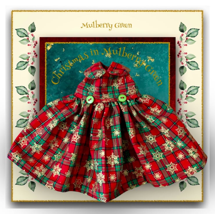 A gorgeous tartan Christmas dress overprinted with golden snowflakes. The dress is handmade from best quality cotton, has a lined bodice and fastens at the back with a little popper