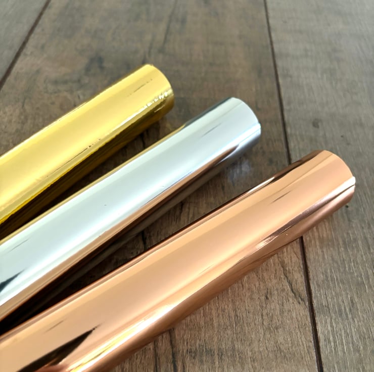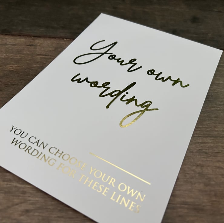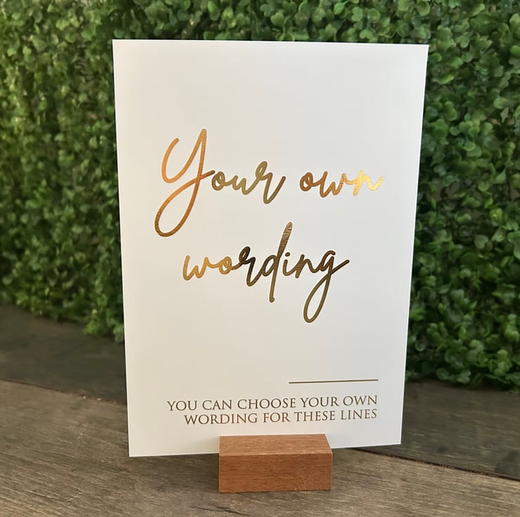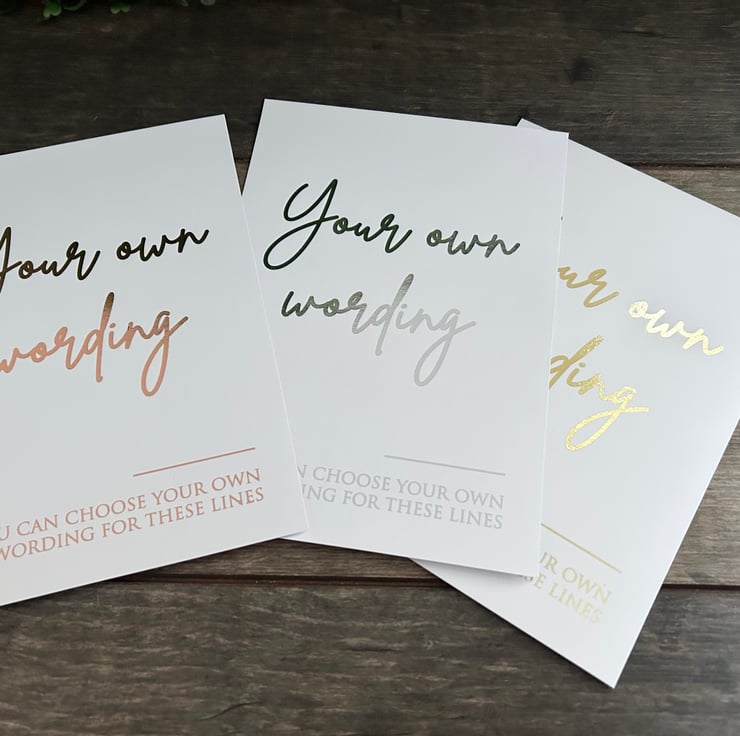 - White smooth thick 350gsm card with wording in choice of silver, gold or Rose Gold Foil.