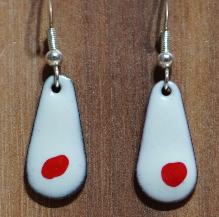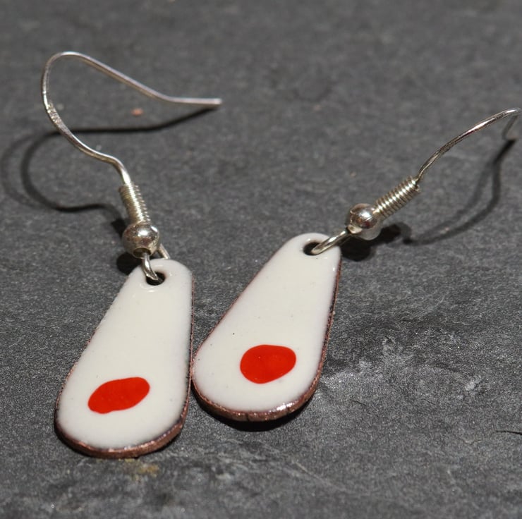 These teardrop shaped earrings are individually hand crafted from copper and enamelled with coloured glass powder. The earrings have been kiln fired with a counter enamel on the reverse for stability and strength.
