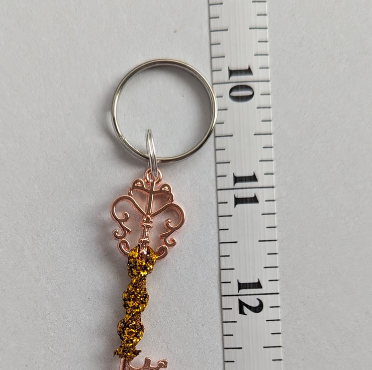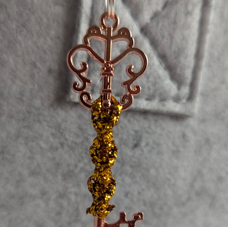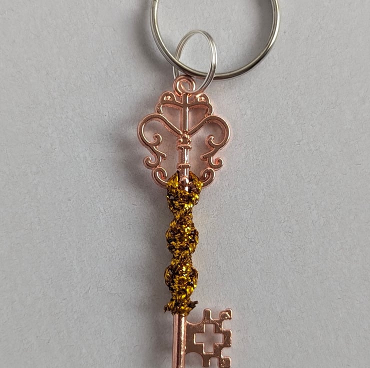 A beautifully handcrafted macrame-style keychain keyring, showcasing intricate knot patterns. This design combines elegance with functionality, offering a lightweight and sturdy accessory. The keyring is attached to a polished metal loop, ensuring secure key attachment, while the macrame adds a touch of artisanal charm. Perfect for personal use, gifts, or as a stylish statement piece for bags or purses.