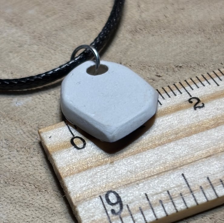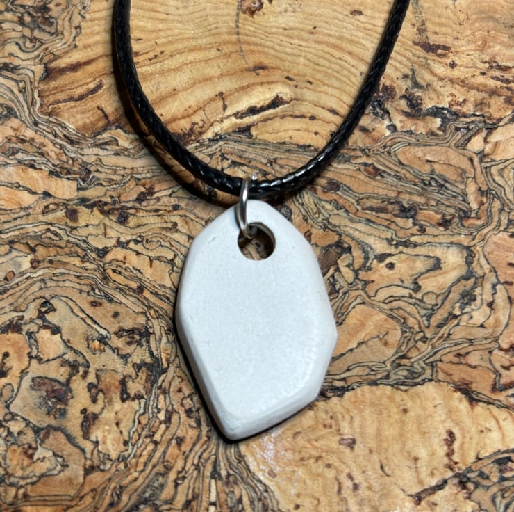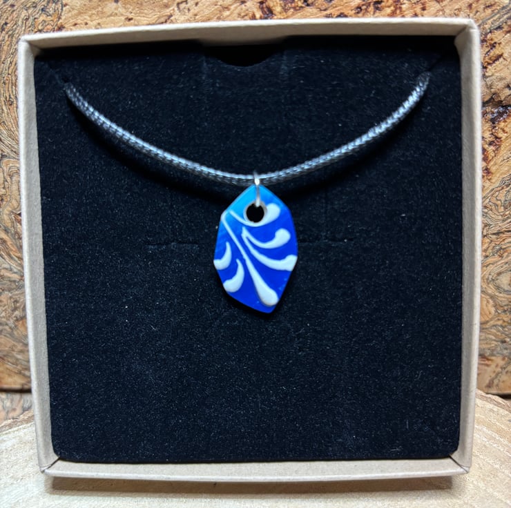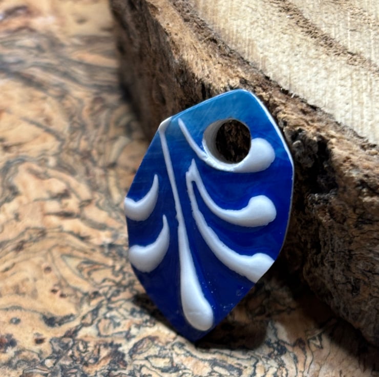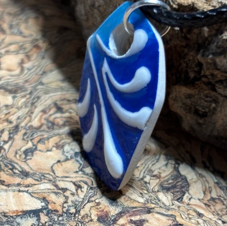 I wasn’t sure if the ceramic would survive when clipped. Thankfully the mug was strong and a few interesting shards created. I have made three pendants, although from the same material, all different and unique. Tactile with raised pattern on striking blue glaze, the colours really stand out. The pendant lays flat, the front it’s very slightly twisted. Back and sides smoothed and sealed with Eco Friendly sealant.