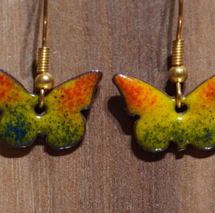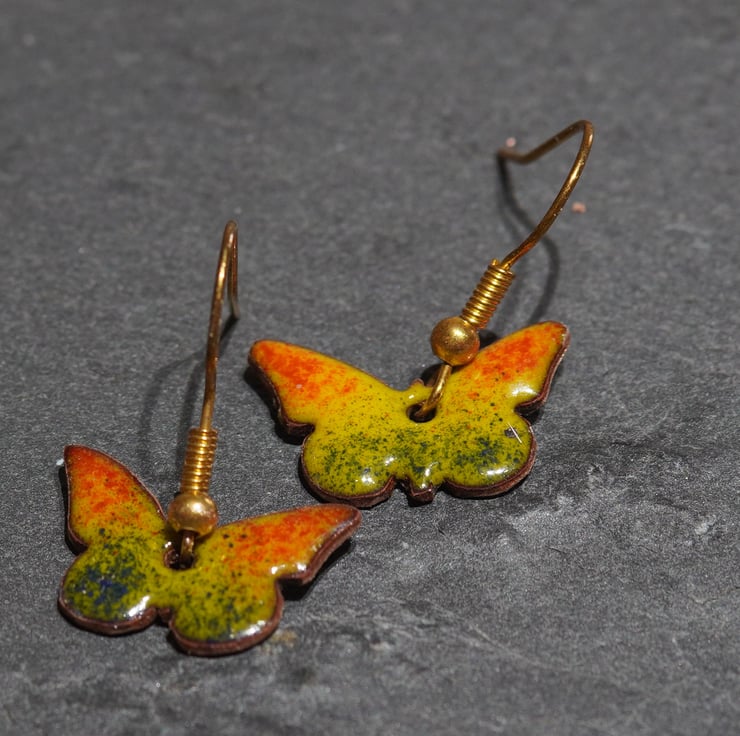 These butterfly shaped earrings are individually hand crafted from copper and enamelled with coloured glass powder. The earrings have been kiln fired with a counter enamel on the reverse for stability and strength.