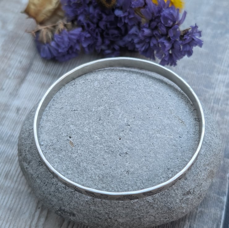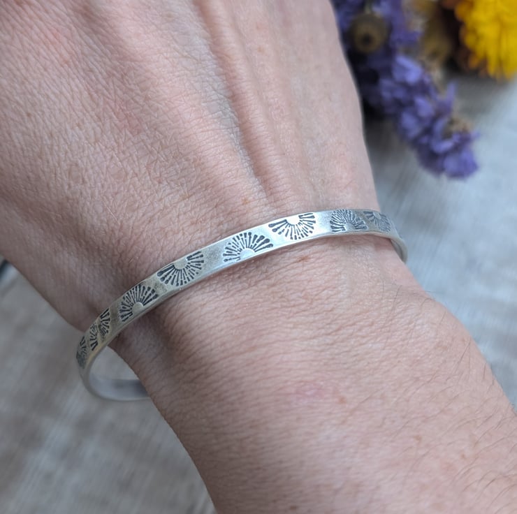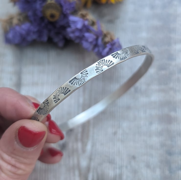This handmade sterling silver bangle features a hand-stamped sunburst pattern, enhanced with an oxidised finish to bring out the intricate details. The satin finish adds a soft, subtle sheen, creating a refined yet understated look.