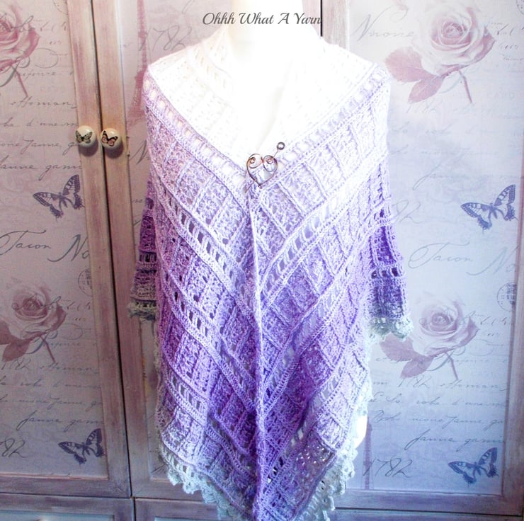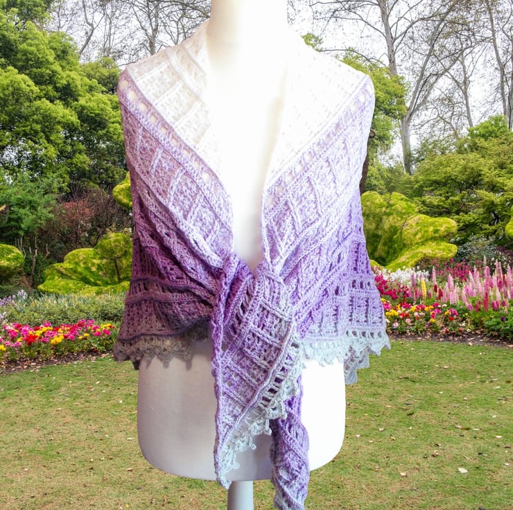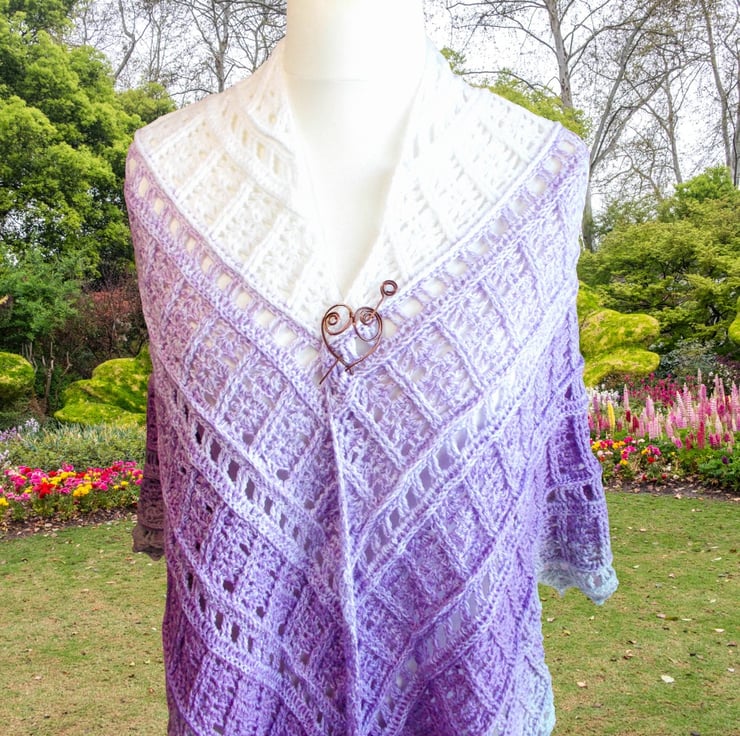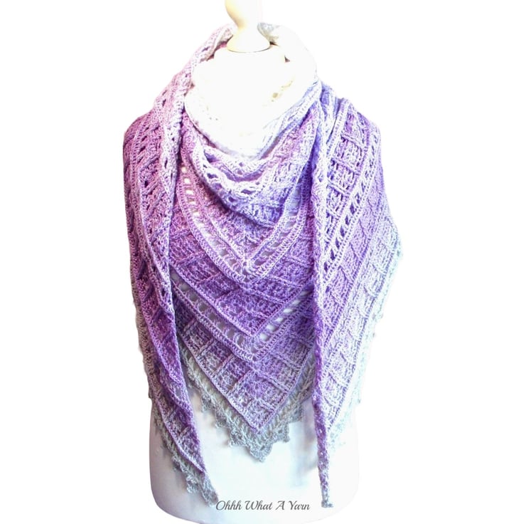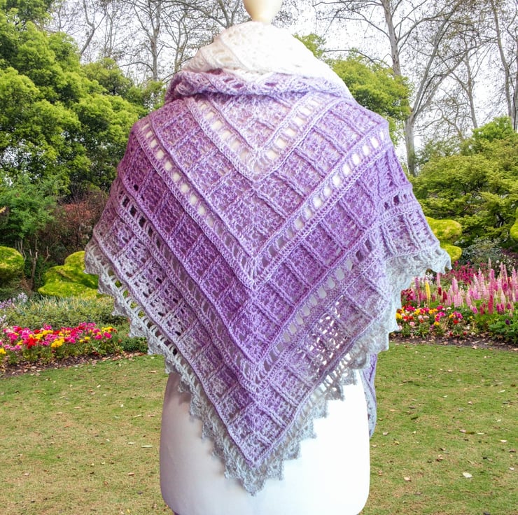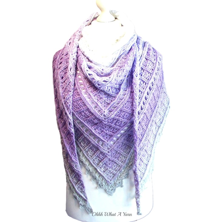This beautiful triangle shawl has been crocheted using a gorgeous 100% acrylic yarn in ombre shades of lilac, grey and white.
