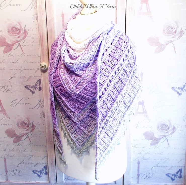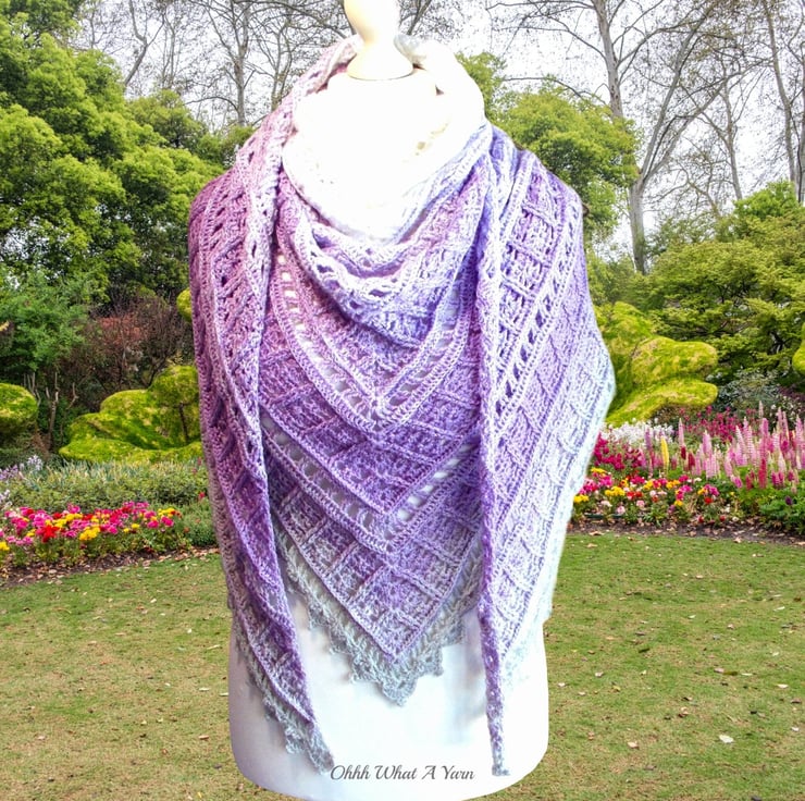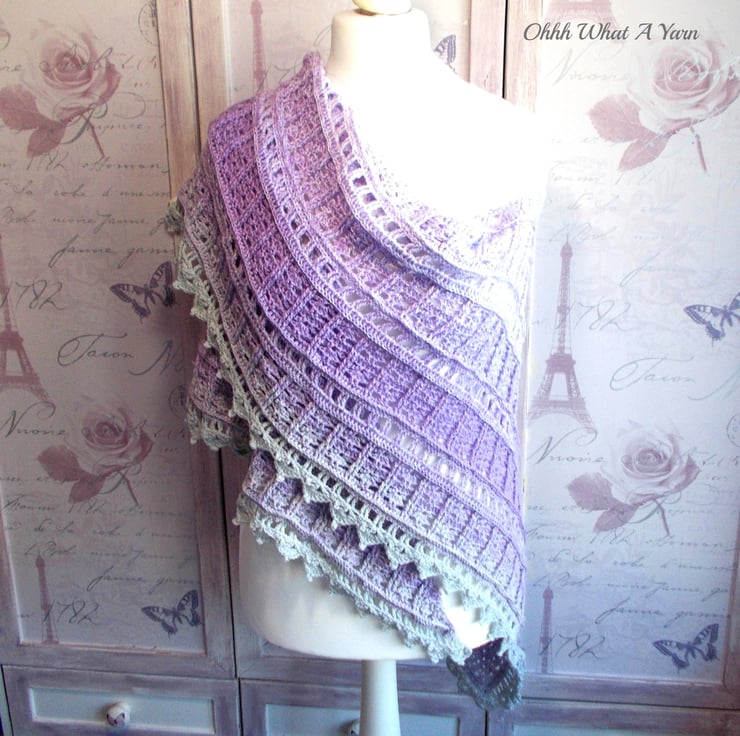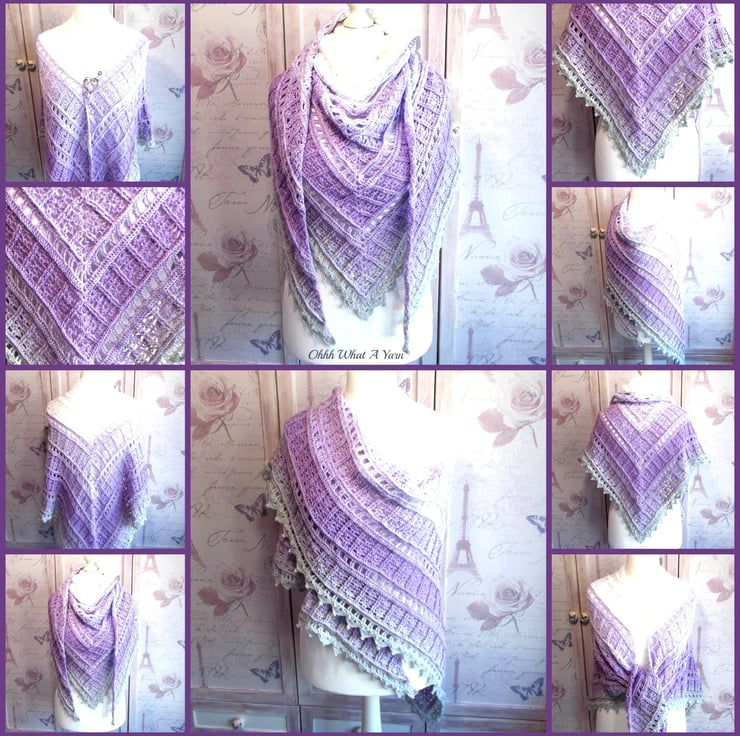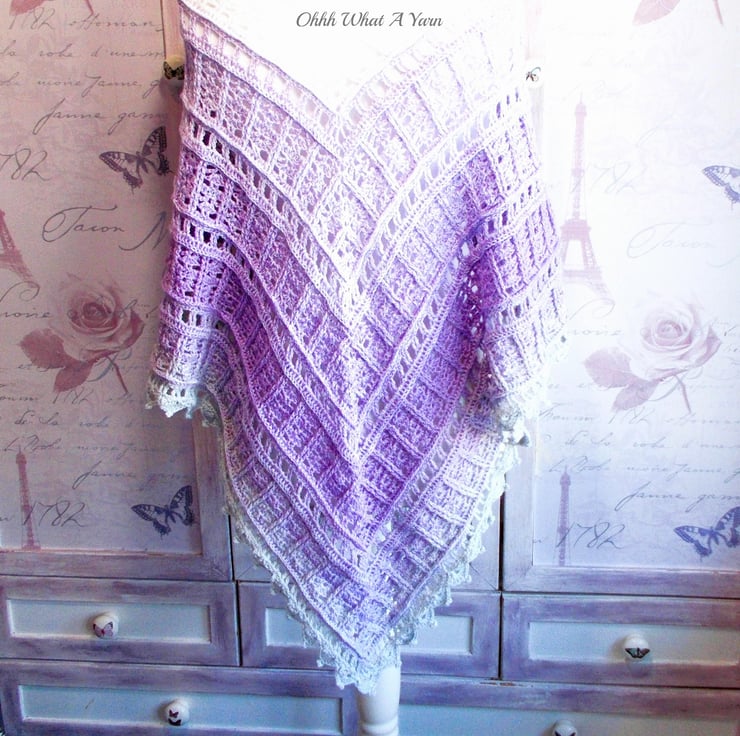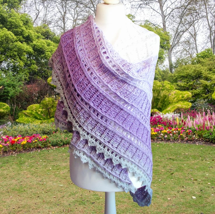 This beautiful triangle shawl has been crocheted using a gorgeous 100% acrylic yarn in ombre shades of lilac, grey and white.