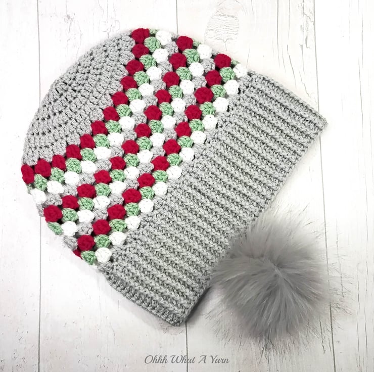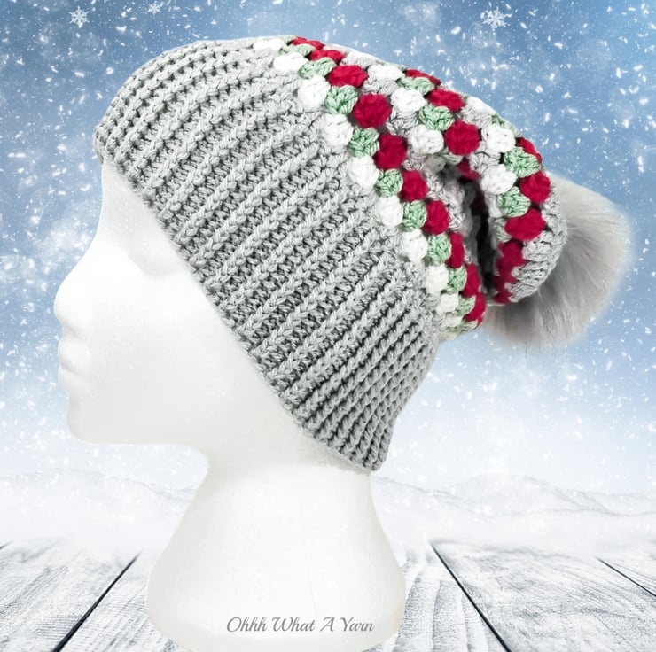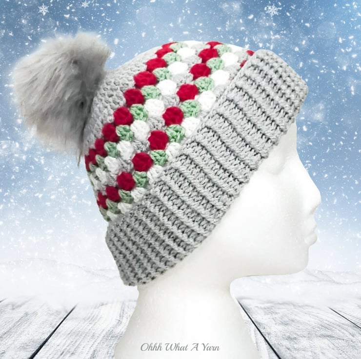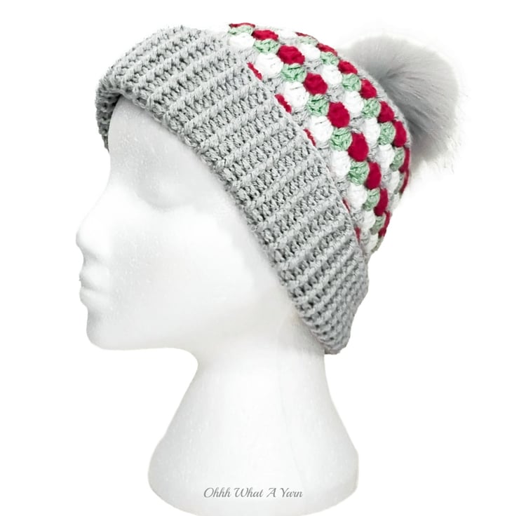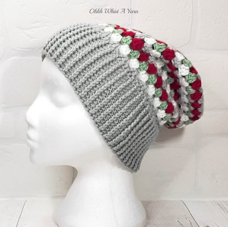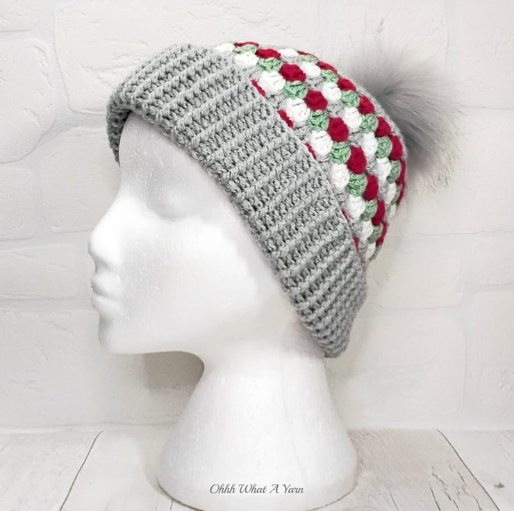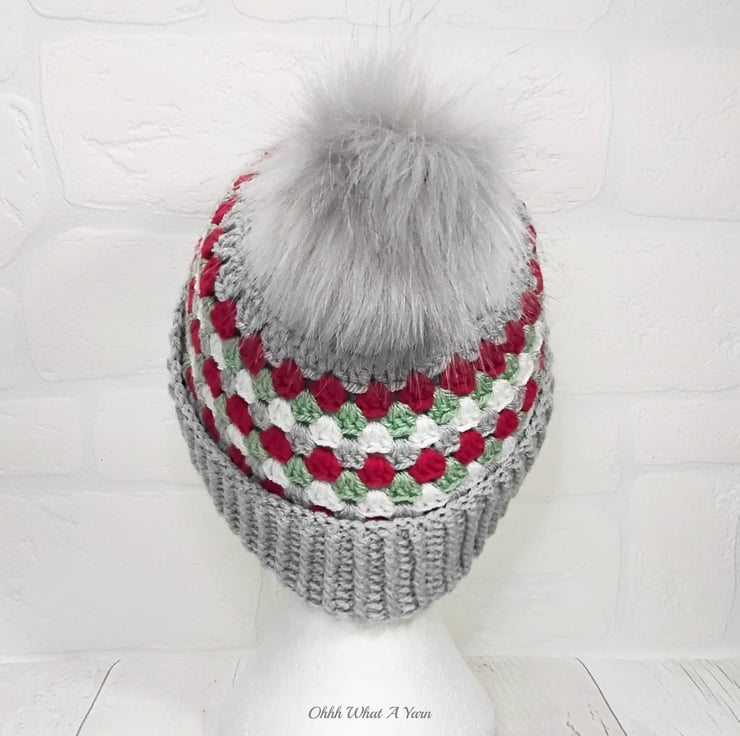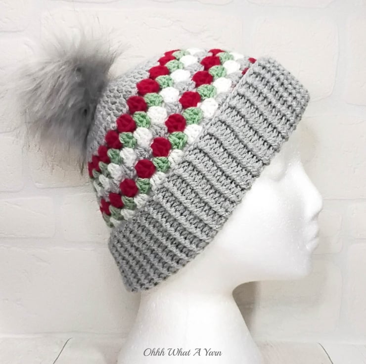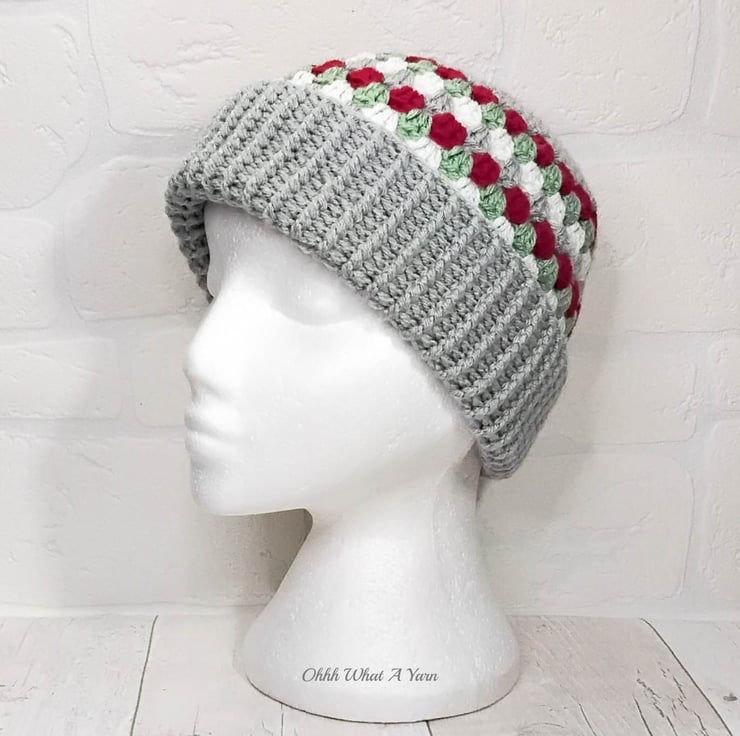 The hat body is crocheted in the fabulous and on trend granny stitch in a gorgeous combination of grey, red green and white yarns and I have added a deep rib border which can be turned up for a classic pompom beanie style or left unturned which allows the hat to be worn as a classic slouch hat, please see photos.