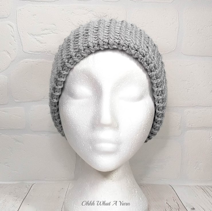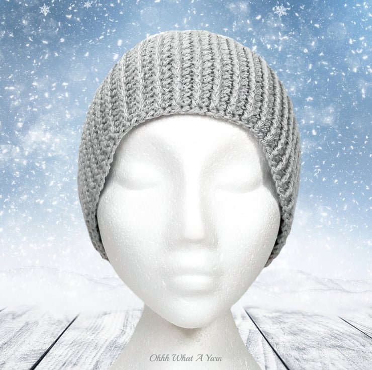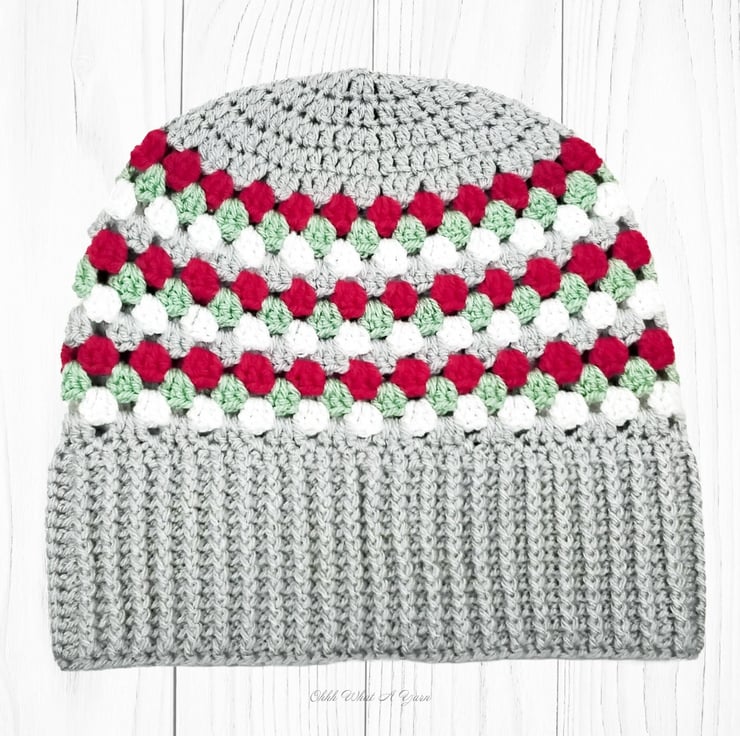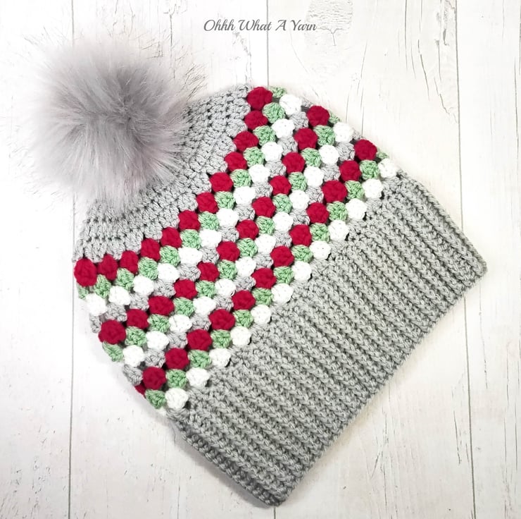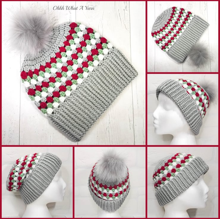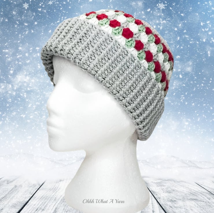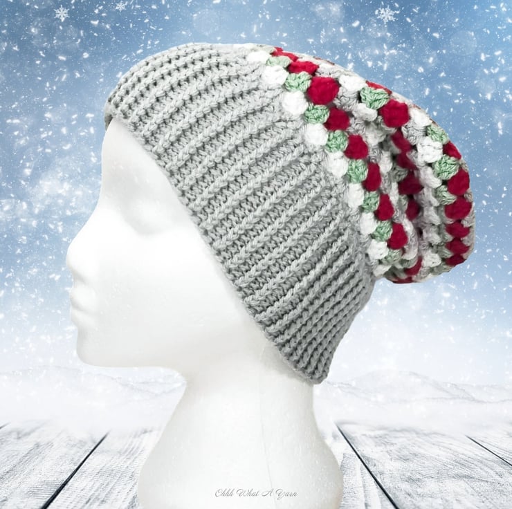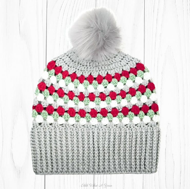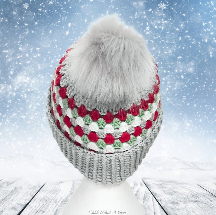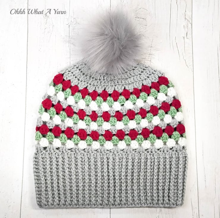 The hat body is crocheted in the fabulous and on trend granny stitch in a gorgeous combination of grey, red green and white yarns and I have added a deep rib border which can be turned up for a classic pompom beanie style or left unturned which allows the hat to be worn as a classic slouch hat, please see photos.