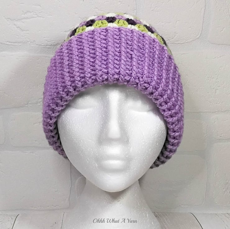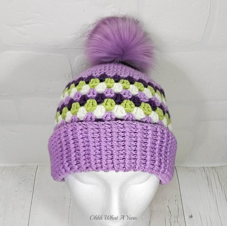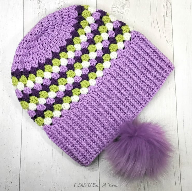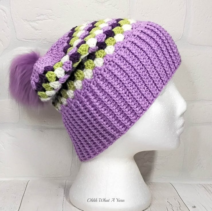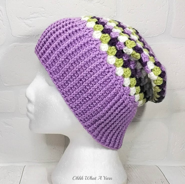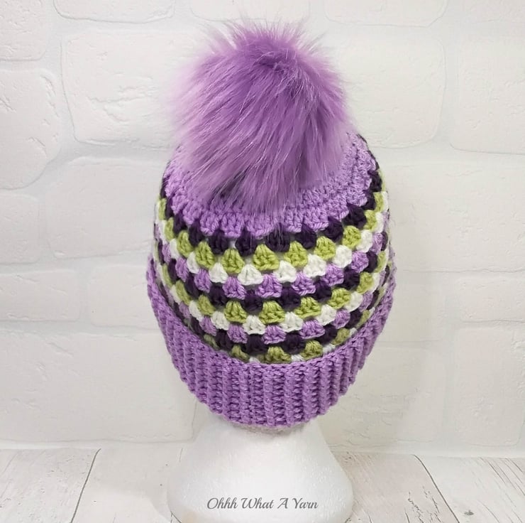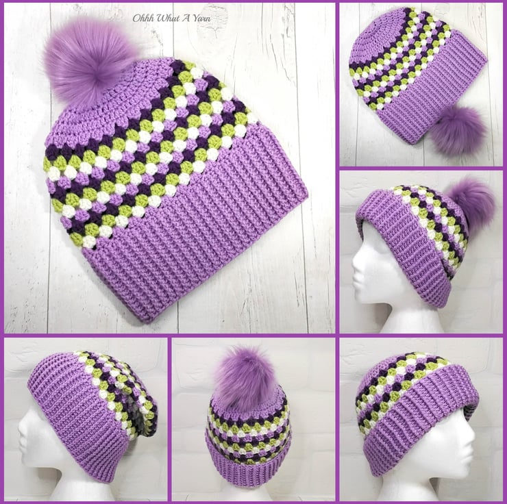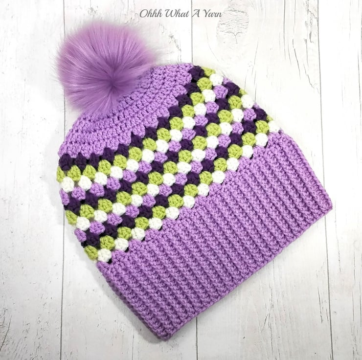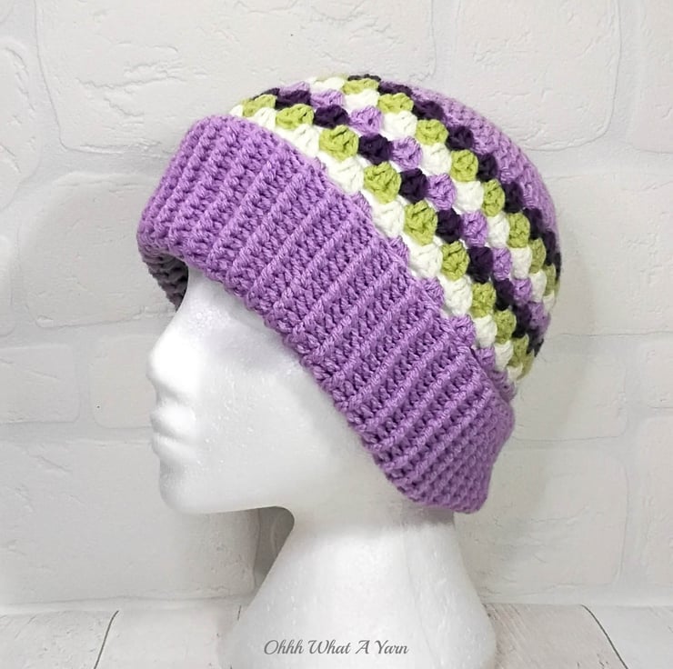 The hat body is crocheted in the fabulous and on trend granny stitch in a gorgeous combination of lilac, purple green and white yarns and I have added a deep rib border which can be turned up for a classic pompom beanie style or left unturned which allows the hat to be worn as a classic slouch hat, please see photos.