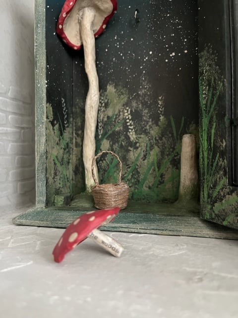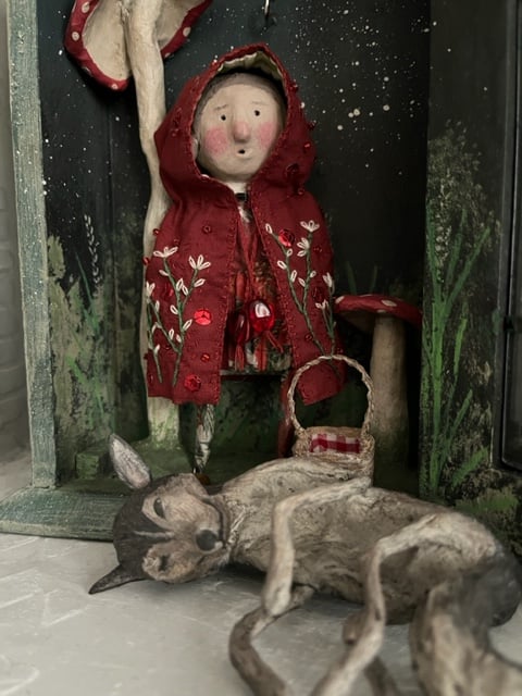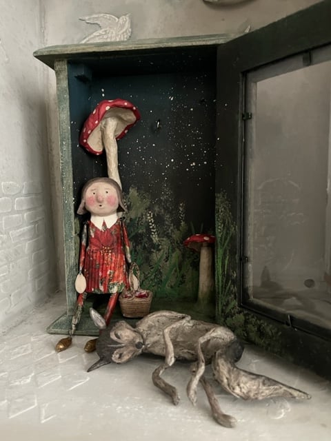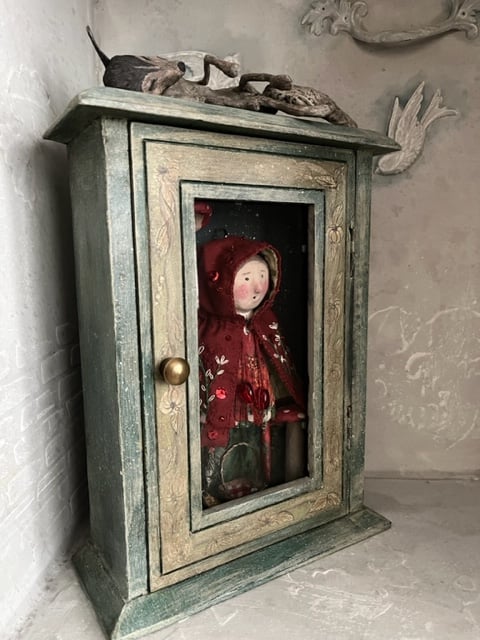 A hand painted, glass-fronted cabinet (formerly used for hanging keys), containing a little paper mache doll in red cape - she hangs by a jump ring from a hook at the back. Her body is decorated with poinsettia paper napkin pieces, and her cape is made from burgundy cotton fabric, embellished with embroidery, seed beads, sequins, and lined with a William Morris-style leaf fabric; she is approximately 19cm tall. Her basket is handmade using paper-covered florist wire, painted, and lined with red and white gingham. She is surrounded by toadstools, one of which hides a message on its stem when you remove the cap … ‘The woods are magical’. Her friend, Wolf, lies on the top of the cabinet overseeing his charge (he, too, is made of paper mache). All elements of this mixed media piece are finished with chalk paint and wax.
