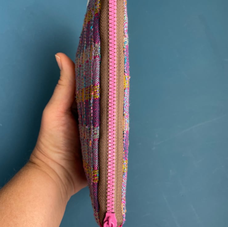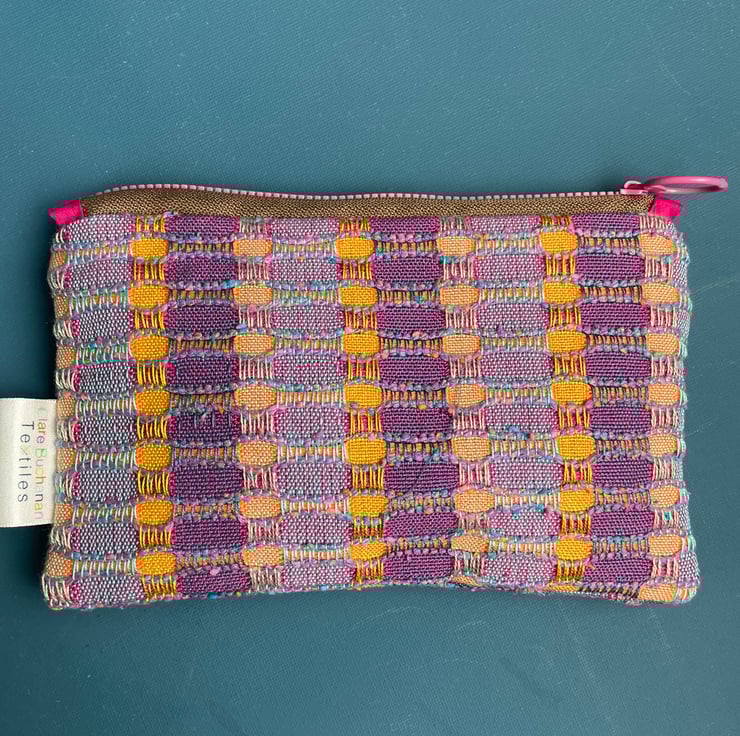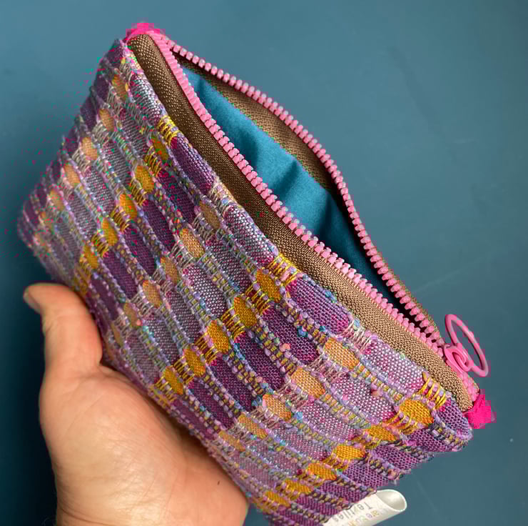 A colourful pouch made from one of my signature handwoven fabrics. Fully lined with a bright cotton/ poly-cotton lining and finished with a chunky ring pull zip. Great gift and useful for storing all sorts of bits, I keep my weaving/ sewing things in mine! Approximately 11x18cm