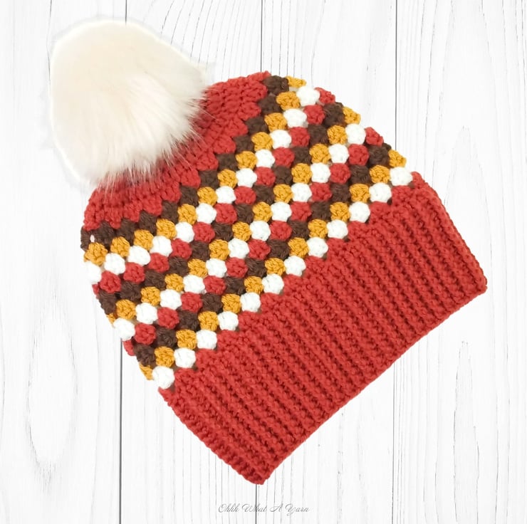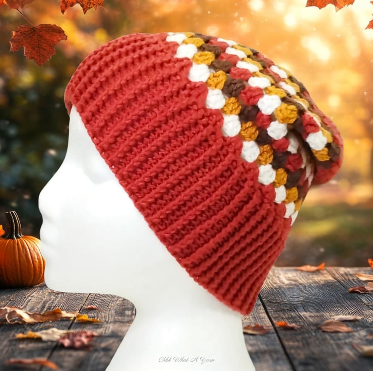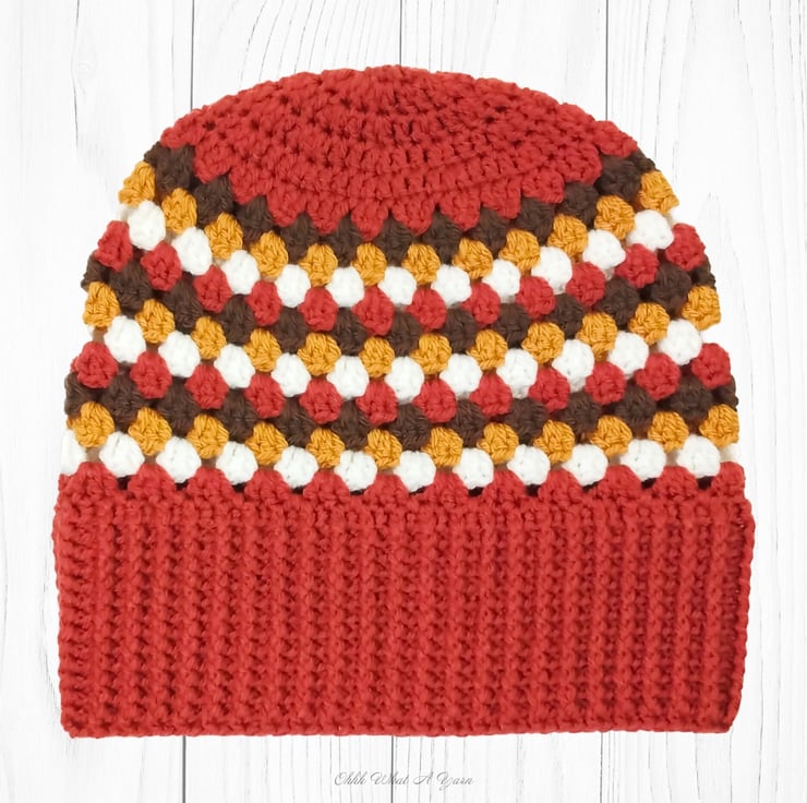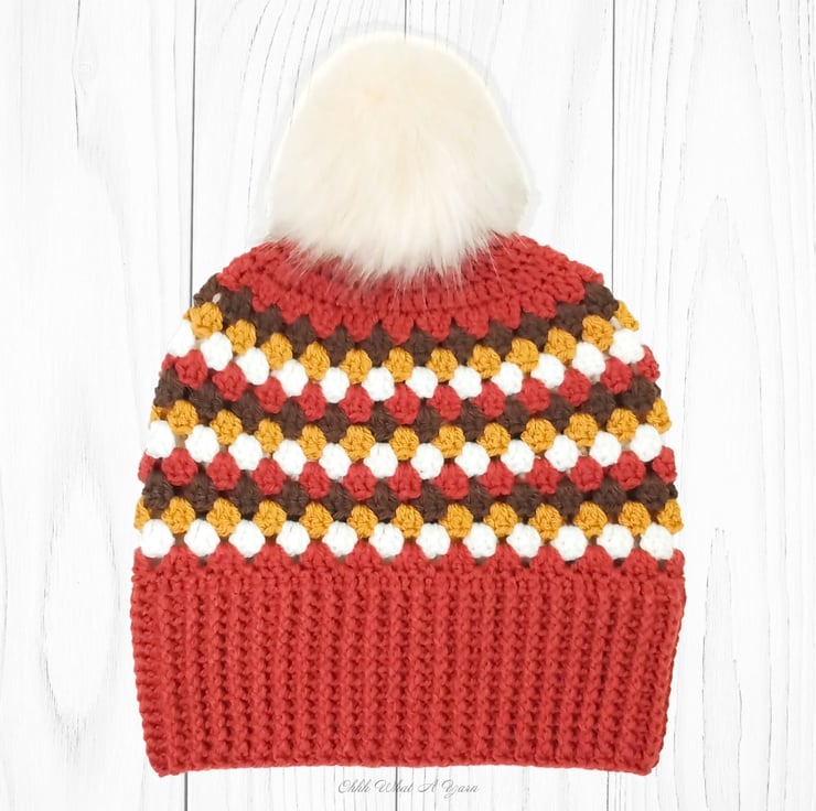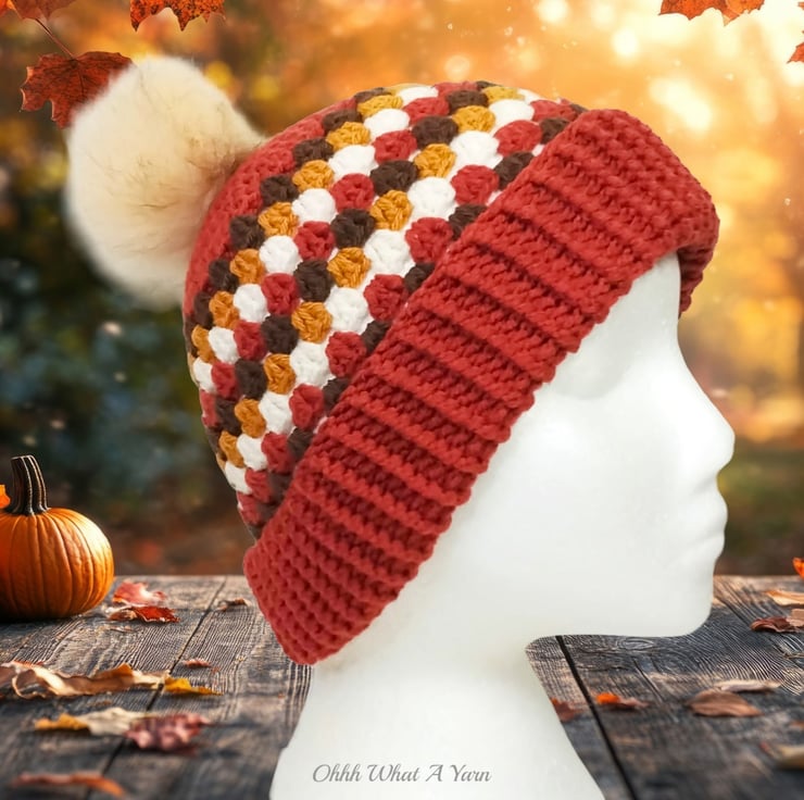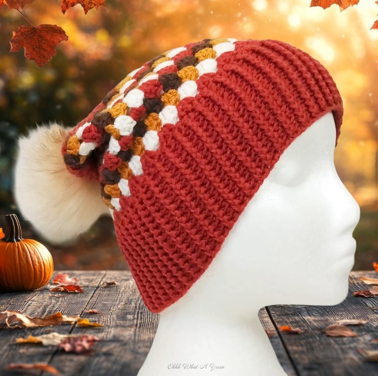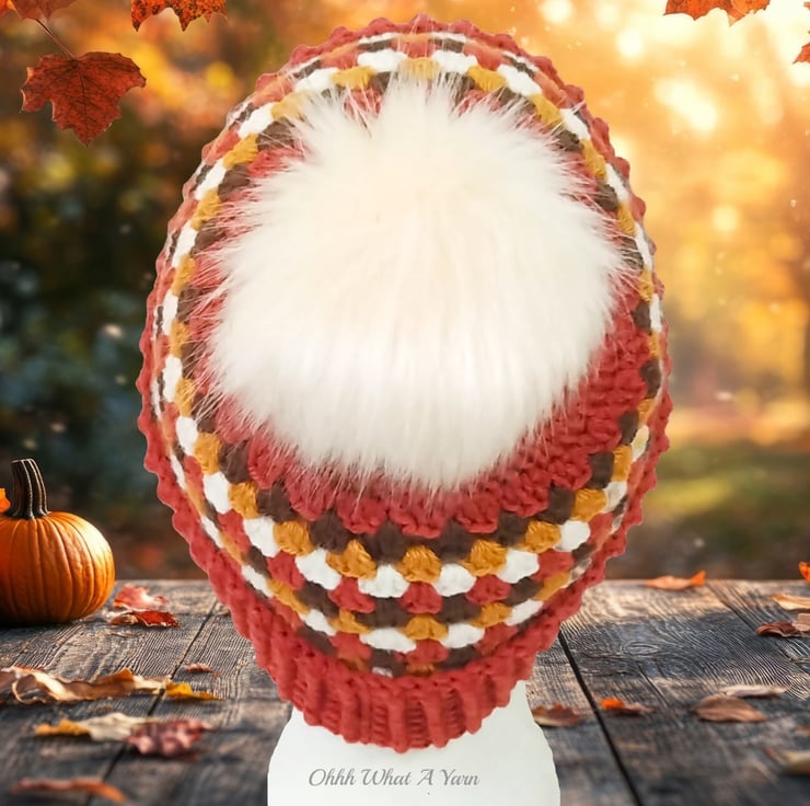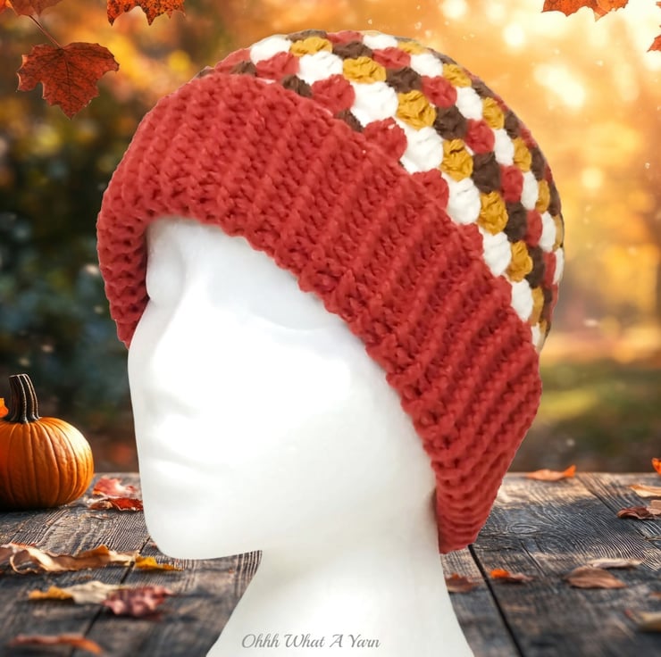The hat body is crocheted in the fabulous and on trend granny stitch in a gorgeous combination of copper, gold, brown and cream yarns and I have added a deep rib border which can be turned up for a classic pompom beanie style or left unturned which allows the hat to be worn as a classic slouch hat, please see photos.