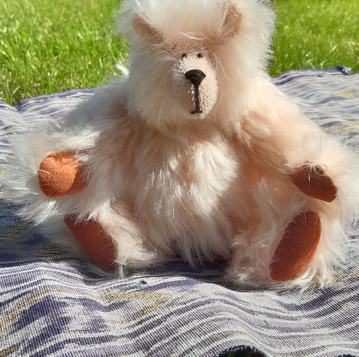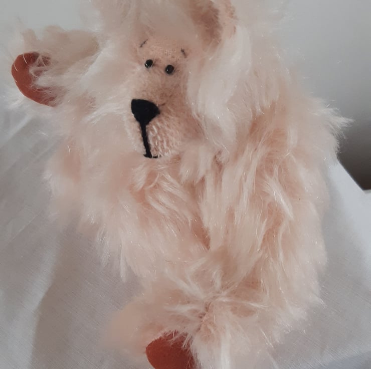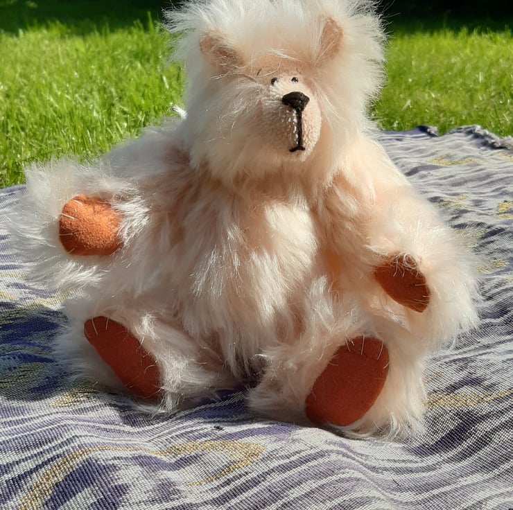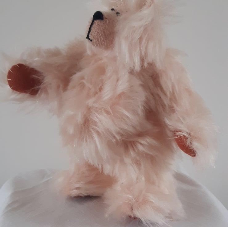 Made from peach coloured distressed mohair, this bear has had a bit of a 'windy hair day'! She is 19cms tall with a rotund tummy (stuffed with polyester bear filling). Her pads are made from faux suede and her eyes are small glass beads. She is fully jointed with cotter pin joints. I have not named her as I think her owner should choose her name, but 'Peaches' or 'Just peachy, thank you' comes to mind.