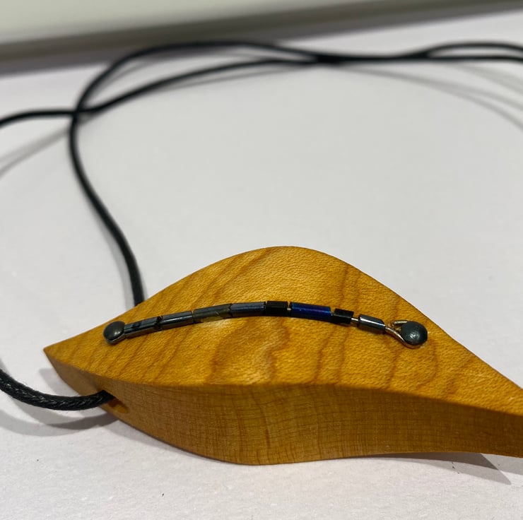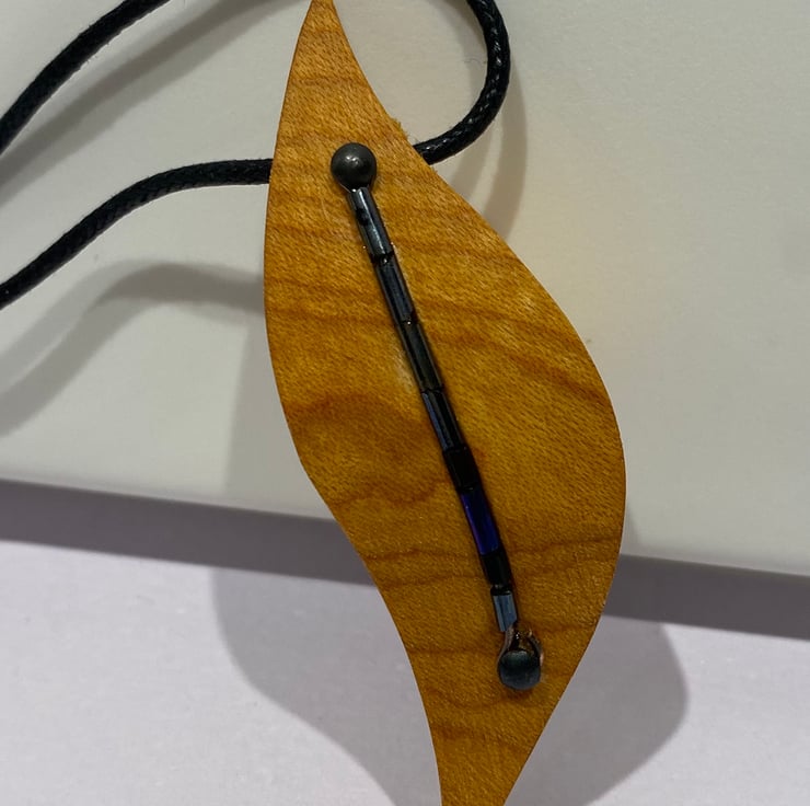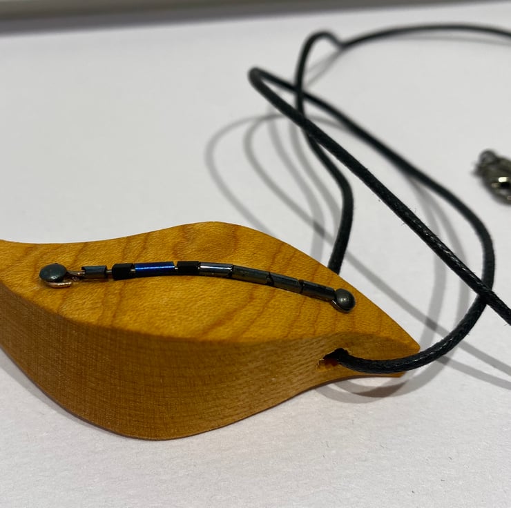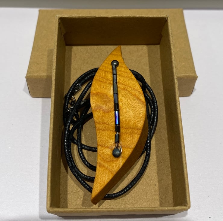 This handmade wooden pendant is made from a chunky piece of amber coloured timber. It is lovely & curvy, measuring 7cm x 3cm. Down the middle are blue glass long beads which shimmer in the light.