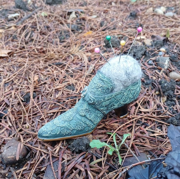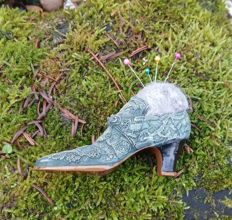 My inspiration for this pin cushion is the antique often silver ones that occasionally come up for sale, this is a more affordable option. The shoe is porcelain, antique in style with a felted wool pad for the needles to sit.