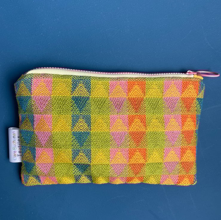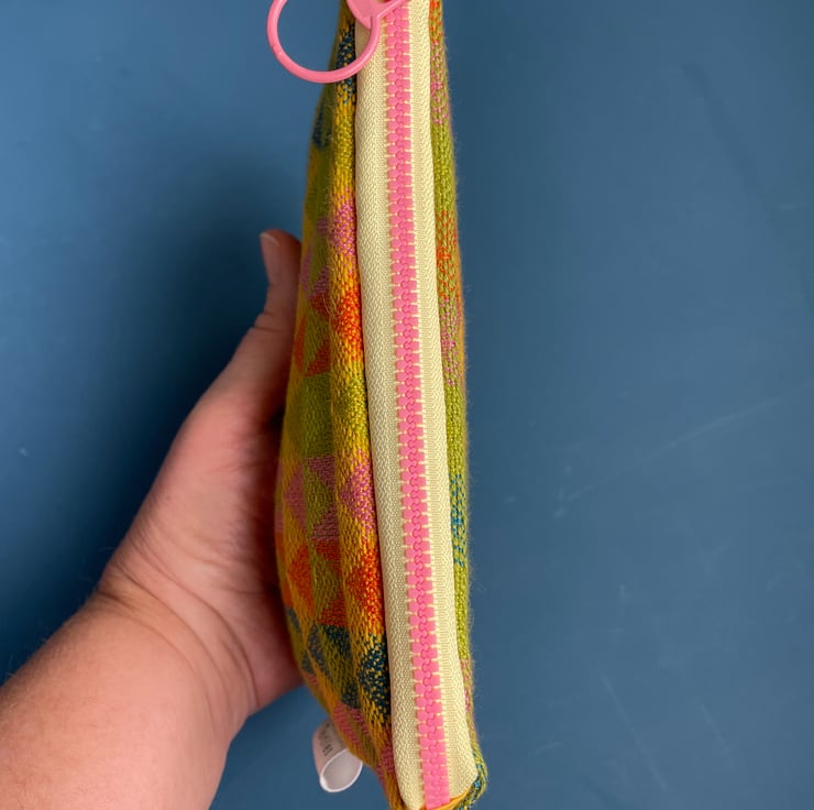 A colourful pouch made from one of my signature handwoven fabrics. Fully lined with a contrast cotton/ poly-cotton lining and finished with a chunky ring pull zip. Great gift and useful for storing all sorts of bits, I keep my weaving/ sewing things in mine! Approximately 11x18cm