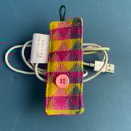 A colourful pouch made from one of my signature handwoven fabrics. Fully lined with a contrast cotton/ poly-cotton lining and finished with a chunky ring pull zip. Great gift and useful for storing all sorts of bits, I keep my weaving/ sewing things in mine! Approximately 11x18cm