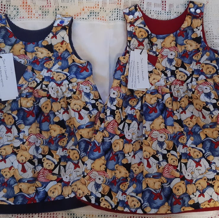 This double layered, reversible pinafore comes with a gorgeous, fun, all-over bear design, teamed with either blue cotton corduroy or red poly cord, for the reverse. The plainer side has a contrasting pocket using the bear fabric. 2 dresses in 1! Easy on with poppers on the shoulder. Lovely and warm due to the 2 layers: great for the winter months teamed up with a top and tights. Sadly this is the last of this high quality bear fabric - but I have made 2 pairs of reversible trousers using it too).