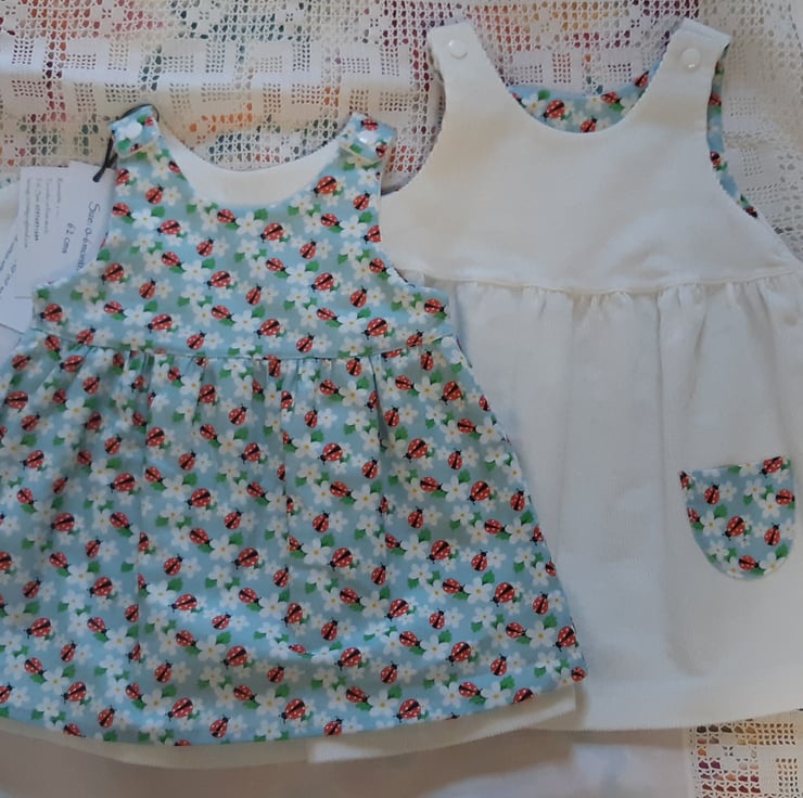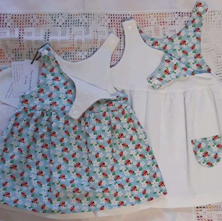 Small ladybirds and flowers on a pale blue background (cotton) teamed with white needlecord (fine courduroy) which has a contrasting pocket using the ladybird fabric, on the reverse. Easy-on using the shoulder poppers. Lovely and warm due to the double layer and when teamed with a top and tights/leggings.