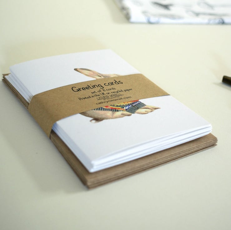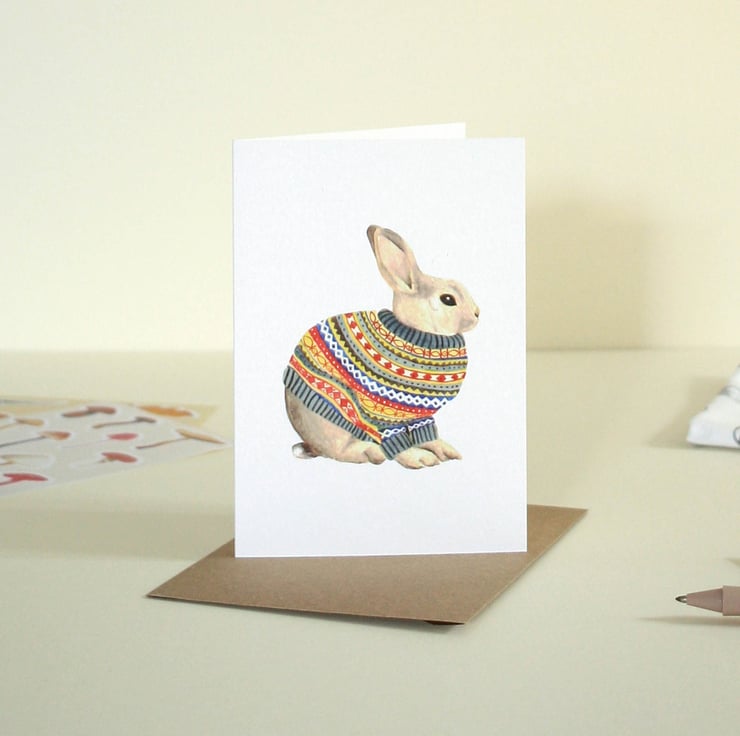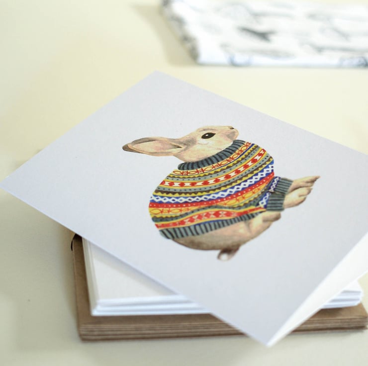 One pack of 8 greeting cards featuring my original illustration of a bunny rabbit wearing a Fair Isle-inspired jumper.