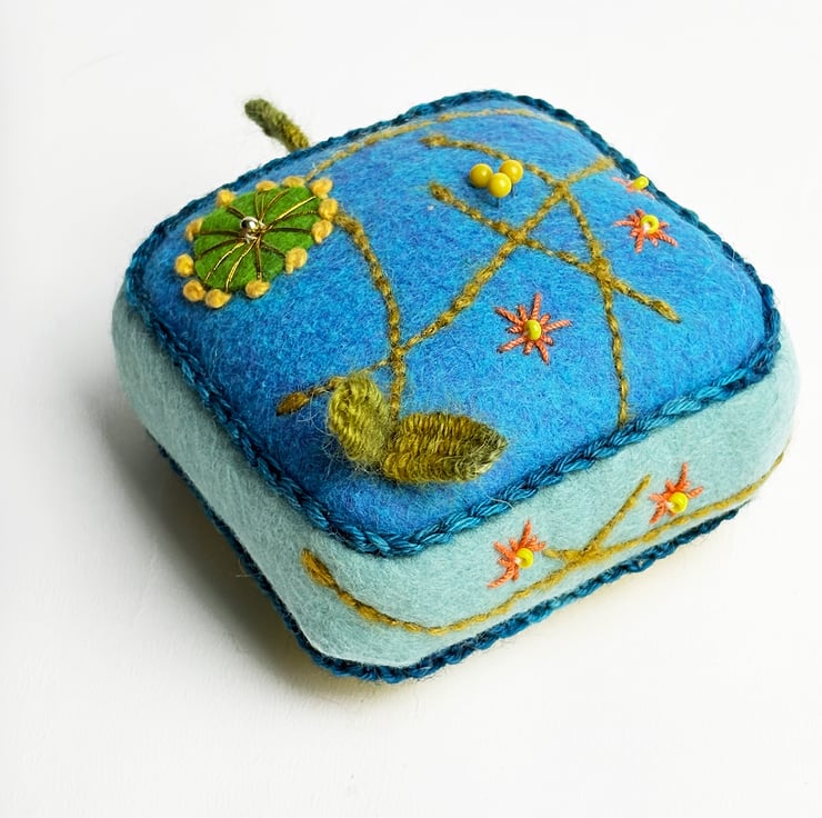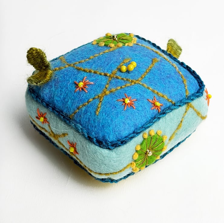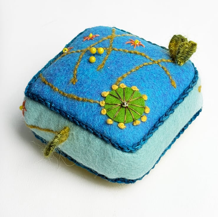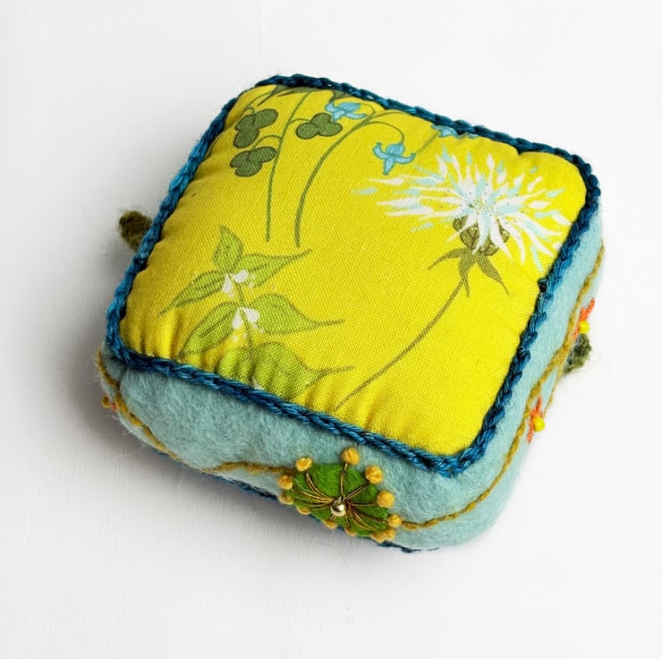 Handmade half cube shaped pincushion with turquoise colour felt on top and light blue felt sides. The pin cushion is hand embroidered with Almond Blossom embroidery design on four sides and on the top in turquoise and green colours. The bottom is made from my Dead Nettle print on cotton. The half cube measures 7.5cms(3ins) in width and 2.5cms(1inch) in depth. A crochet trim has been added to the seams in blue yarn. The pincushion comes with some pins.