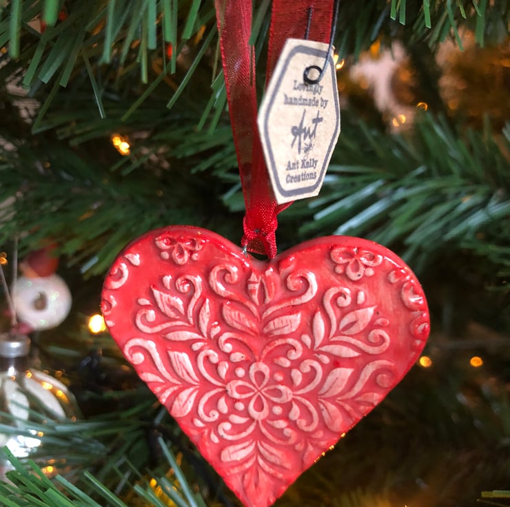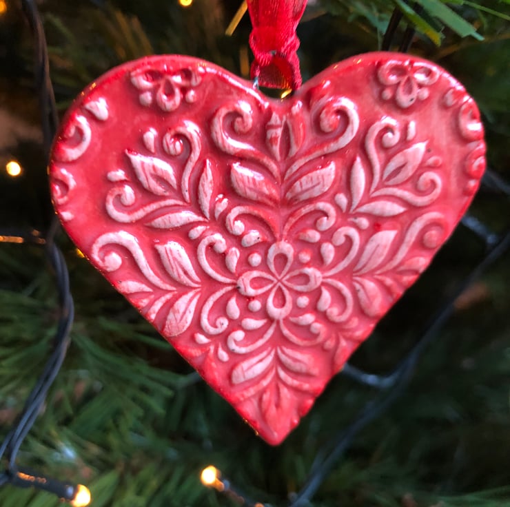 Glossy glazed red heart hanging decorations with vintage embossed texture