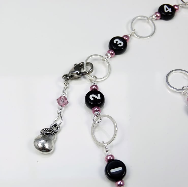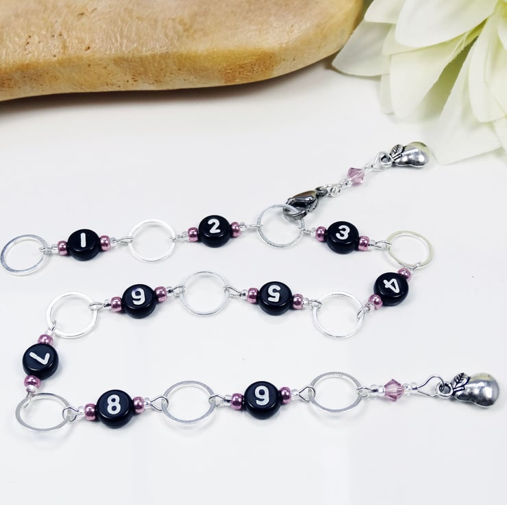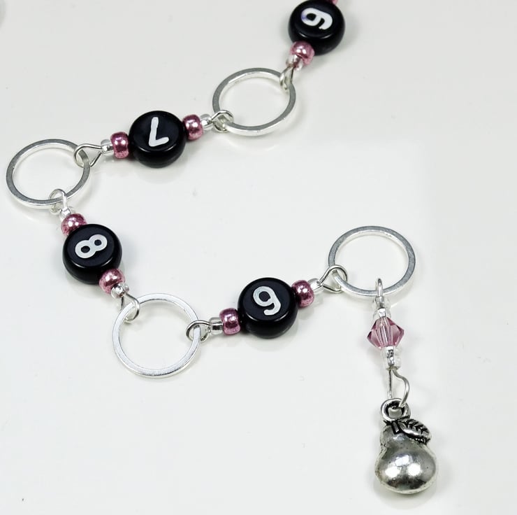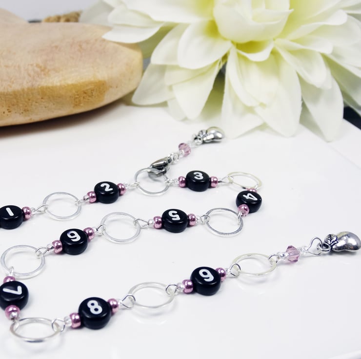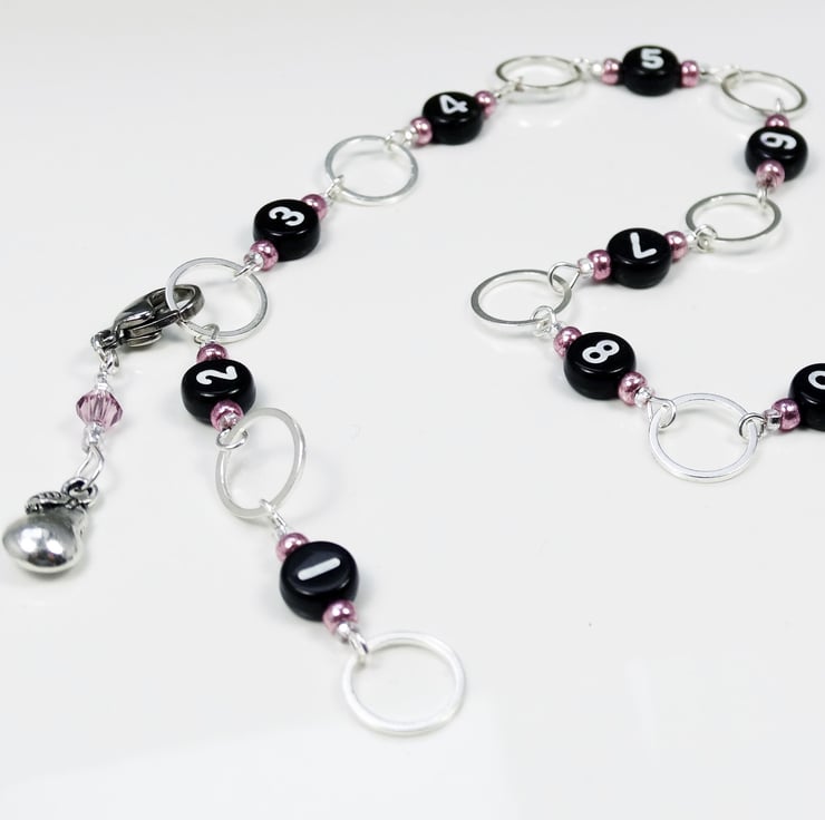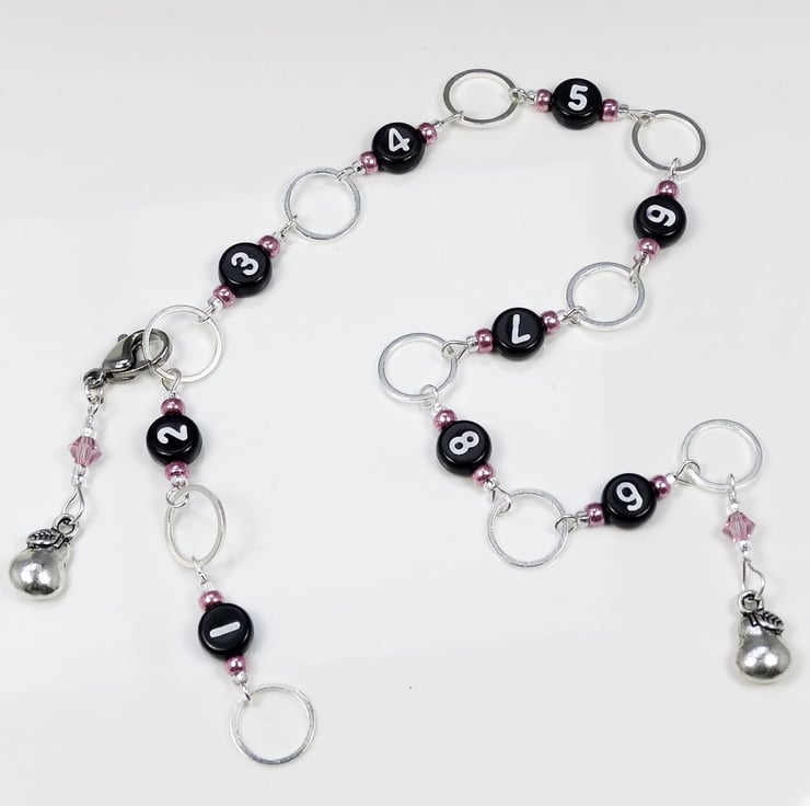 This hand beaded Row Counter is made from black acrylic number beads with white numbers, silver lined glass detail beads. Includes a silver plated clip-on silver pear marker to count the tens. The end of the chain is finished with an amethyst crystal and pear charm. The pear silver charm is double sided.