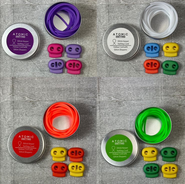 Our flexible silicone hollow cords are easy to use and slip onto most needles to enable the WIP to be moved onto the cord to free up needles, hold a section of knitting and to try on your knitting as you go.