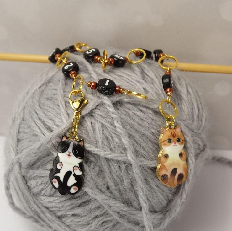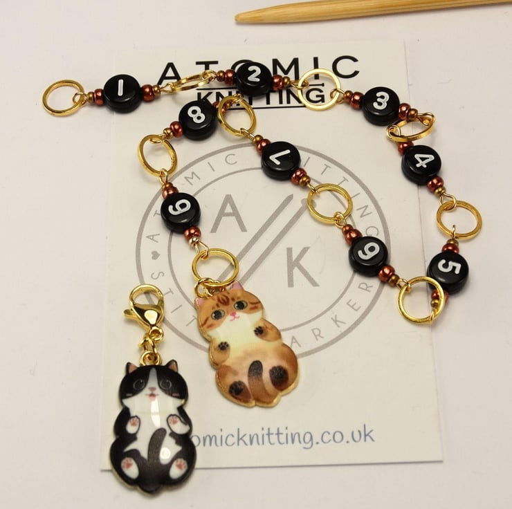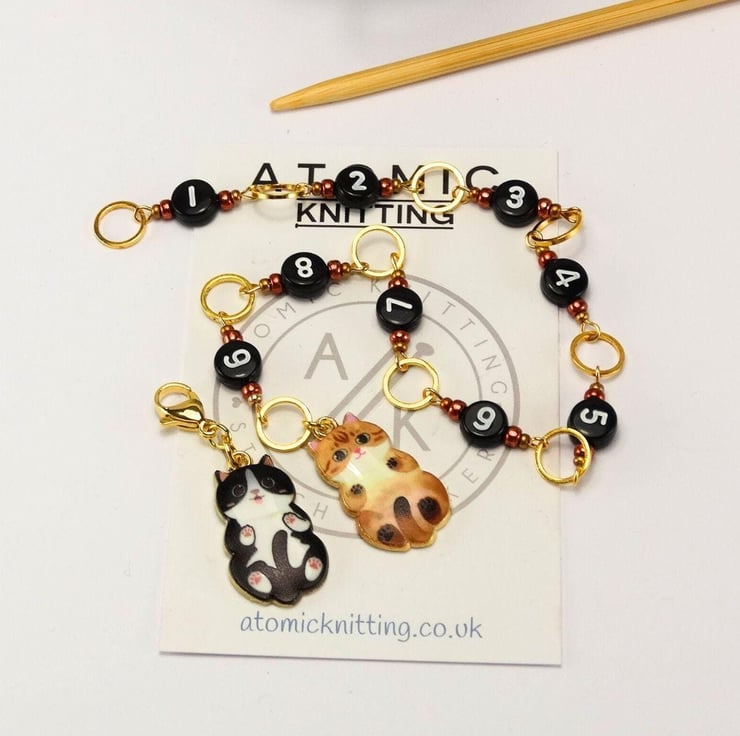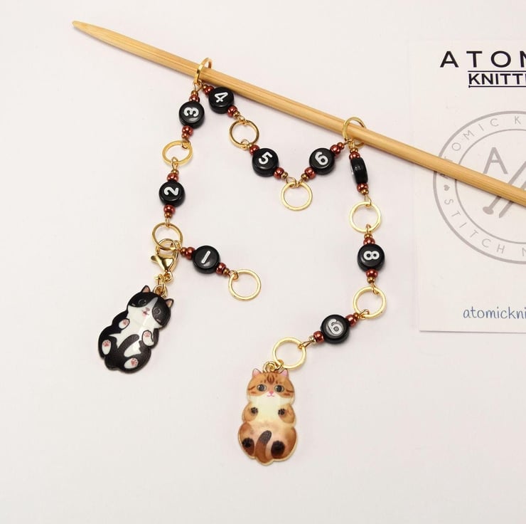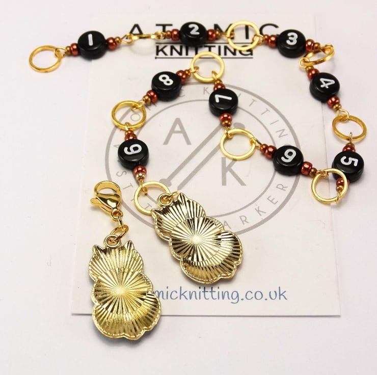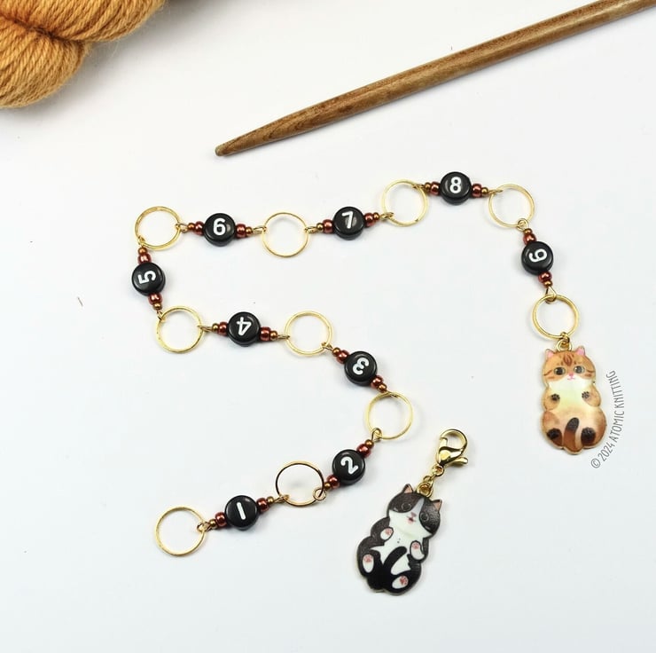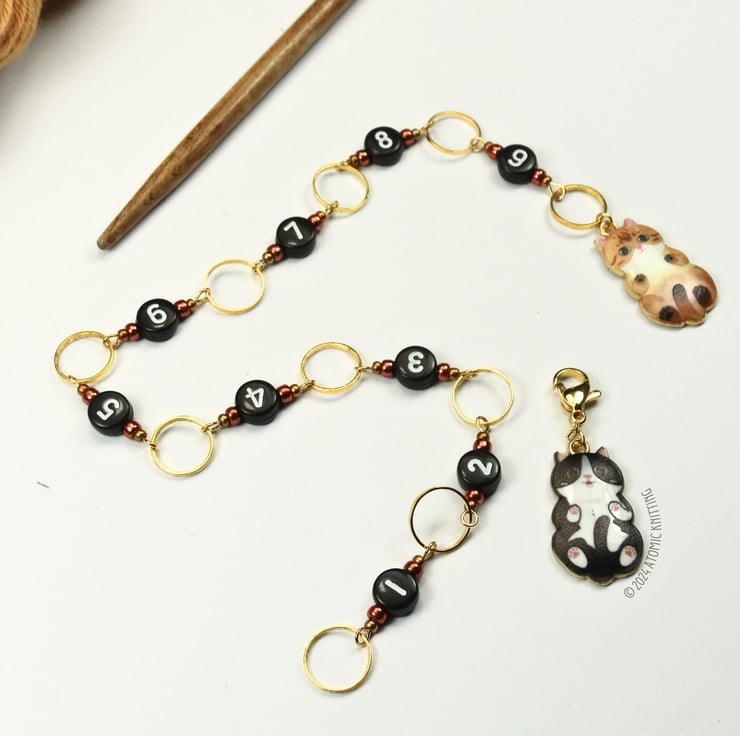 This hand beaded Row Counter is made from black acrylic beads with white numbers and gold solid snag free rings. Includes an enamel cat clip on marker (to count the tens). There is no 0 (zero) bead, and there are 10 rings. The end of the chain is finished with an enamel cat charm. The charms are single sided.