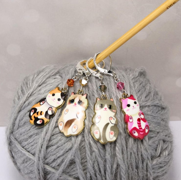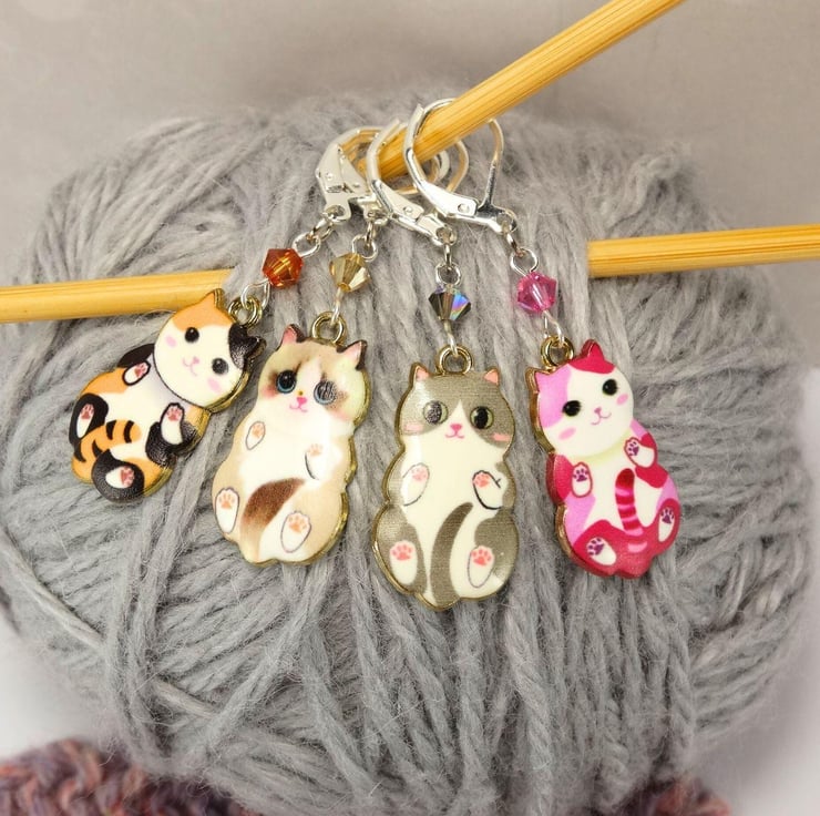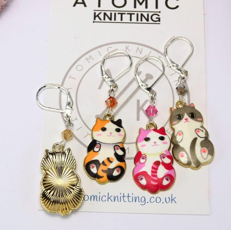 Add charm to your knitting with these adorable cat stitch markers. Each marker features an enamel cat charm and a colourful crystal bead. Perfect for keeping track of your stitches in style! Set of 4 stitch markers, presented on Atomic Knitting card.