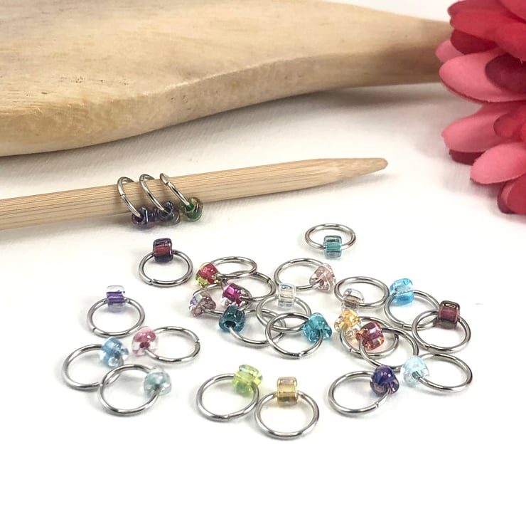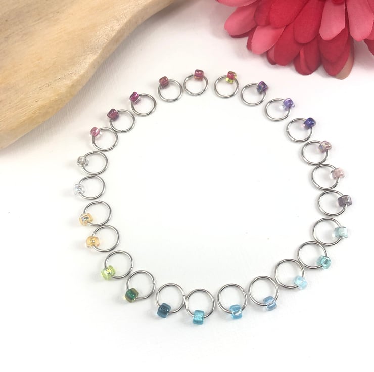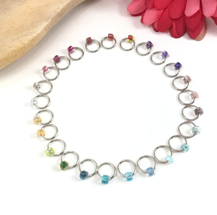 Set of 25 knitting stitch markers in a colourful rainbow of Japanese miyuki glass TRIANGLE beads. On stainless steel rings. Colours may vary to those shown.