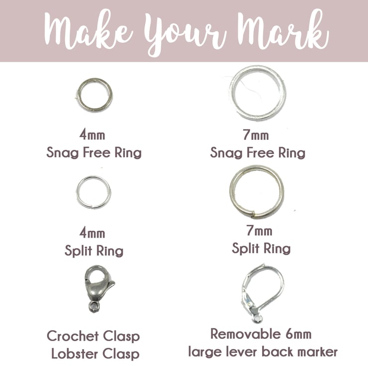 High quality stitch markers for knitting, row counter chains, knitting cords & stoppers, magnetic pattern marker guides, cardigan clips & useful tools for knitting & crochet.