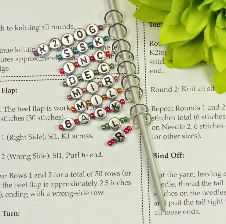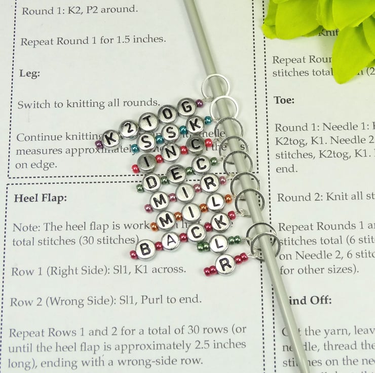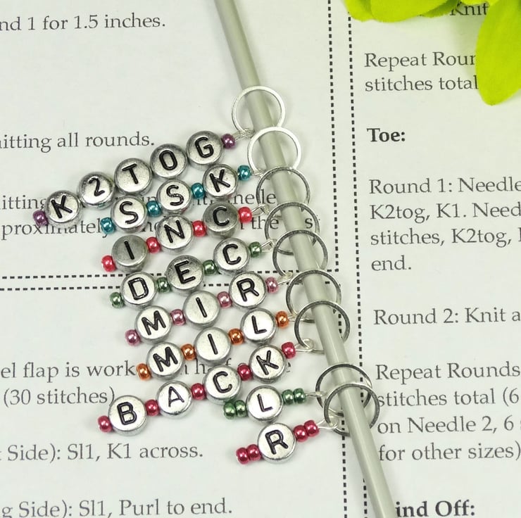 Instructional stitch markers to aid knitting pattern! Choose rings or clasps and use our knitting abbreviation stitch markers to gain confidence in your knitting when following a pattern.