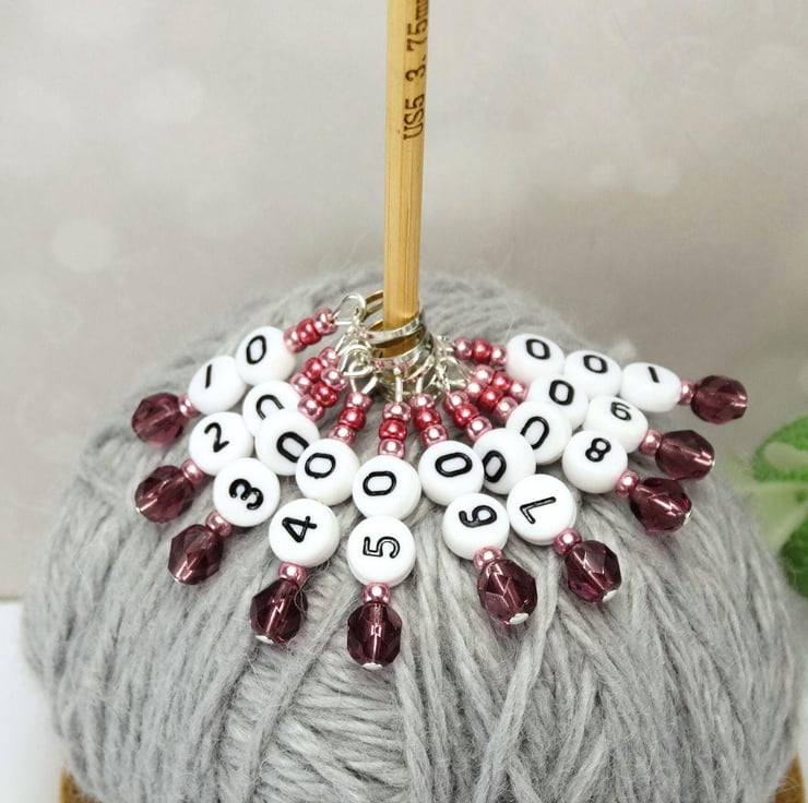 Lightweight numbered stitch markers to keep track of pattern repeats, row counts, pattern sections, stitch blocks and repeats whilst casting on or knitting or crocheting large numbers of stitches.