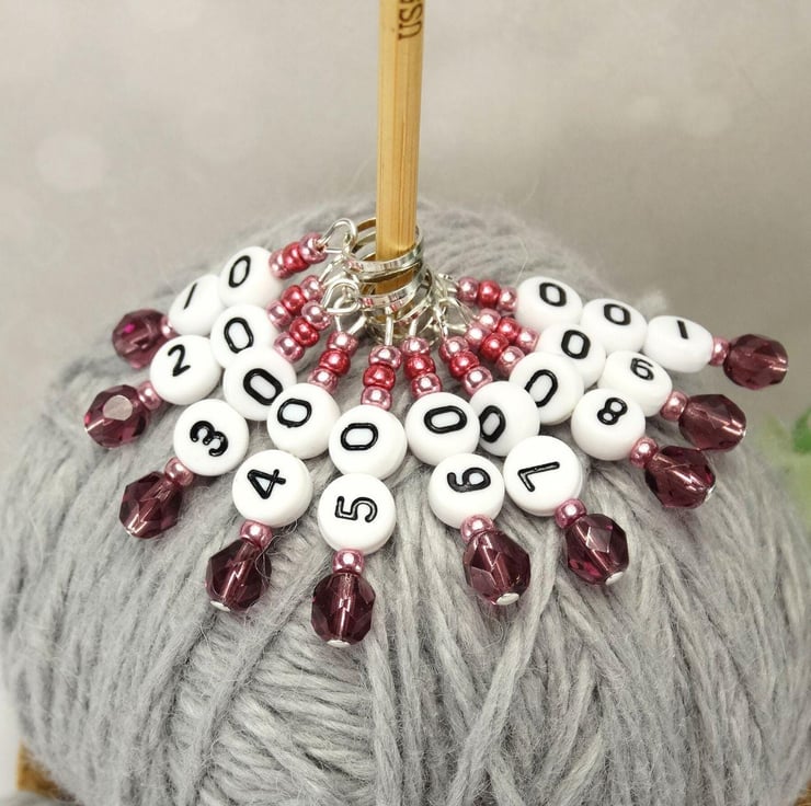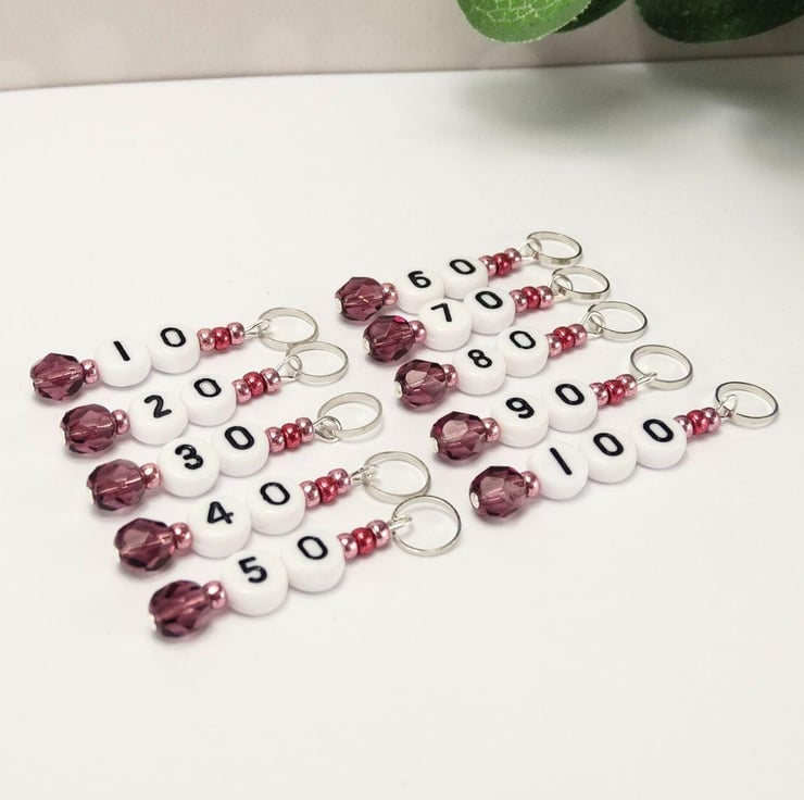 Raspberry beaded number stitch markers 10-100 (set of 10) for knitting or crochet. Count blocks of stitches, pattern repeats, stitches and rows in both knitting and crochet. Lightweight stitch markers for knitting.