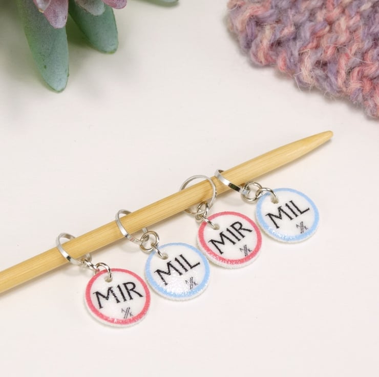 Set of 4 m1L & m1R (Make 1 Left & Make 1 Right) Stitch Markers for knitting with colourful designs - single sided plasticised paper discs with printed instructions for knitting. 2 stitch markers of each instruction. Super lightweight stitch markers for knitting.