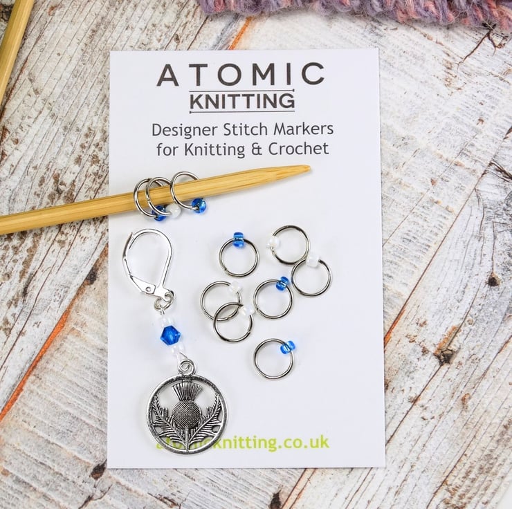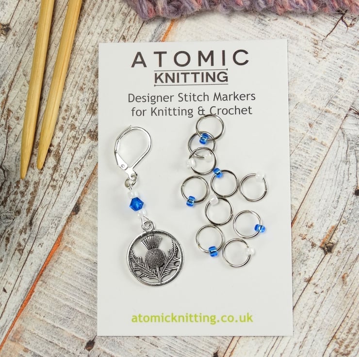 Set of 11 knitting stitch markers with blue and white beads on a stainless steel ring. Plus one thistle charm progress marker with a blue crystal and a removable clip that can be used on needles up to 6mm or clipped directly to a stitch. Use it to track progress or mark specific stitches.