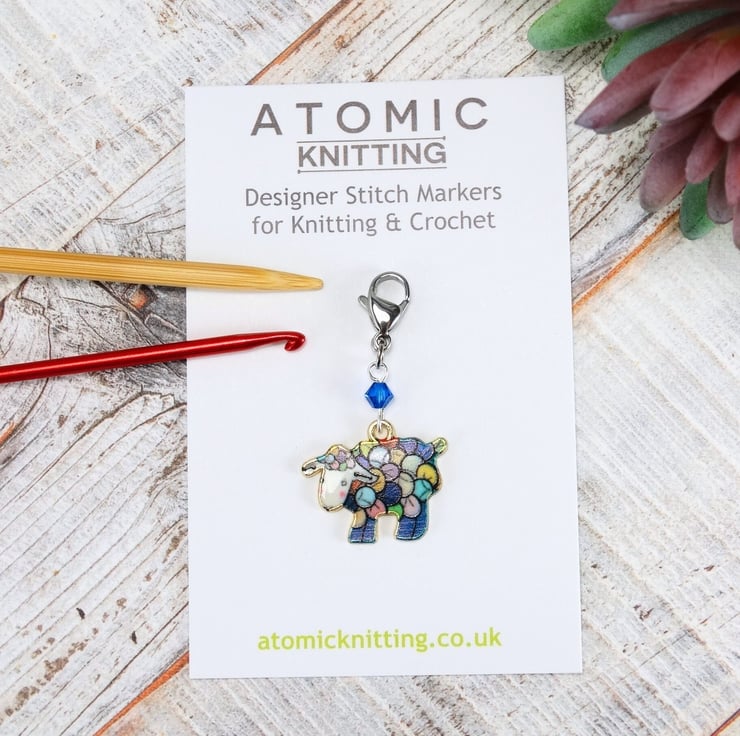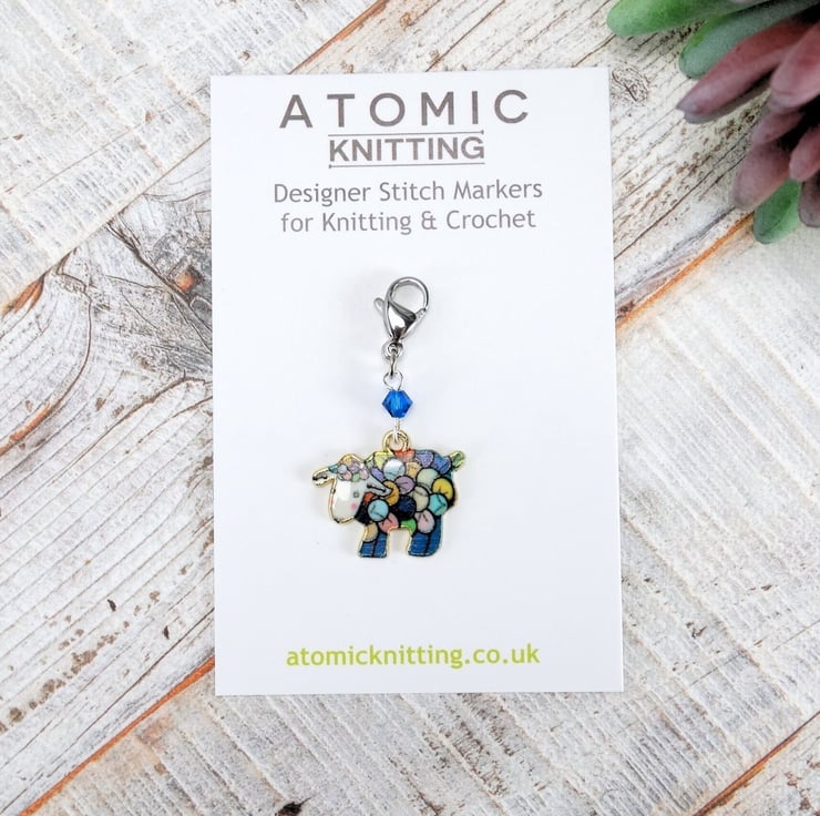 Single sided blue and white enamel sheep stitch marker with a sparkly blue glass crystal and silver ring or clasp option. Use as a progress stitch marker or as a general row or stitch marker.