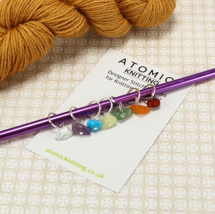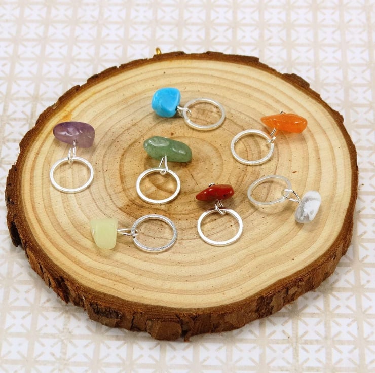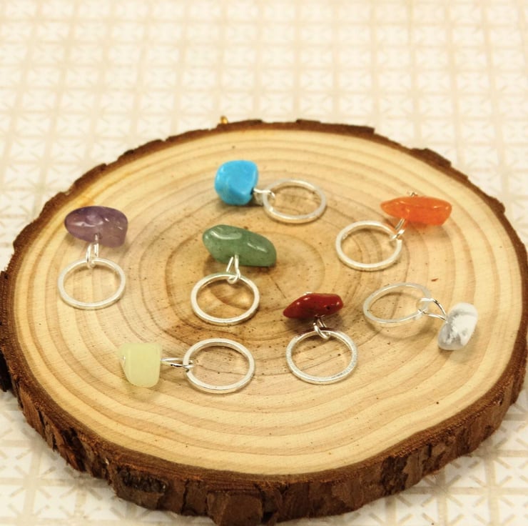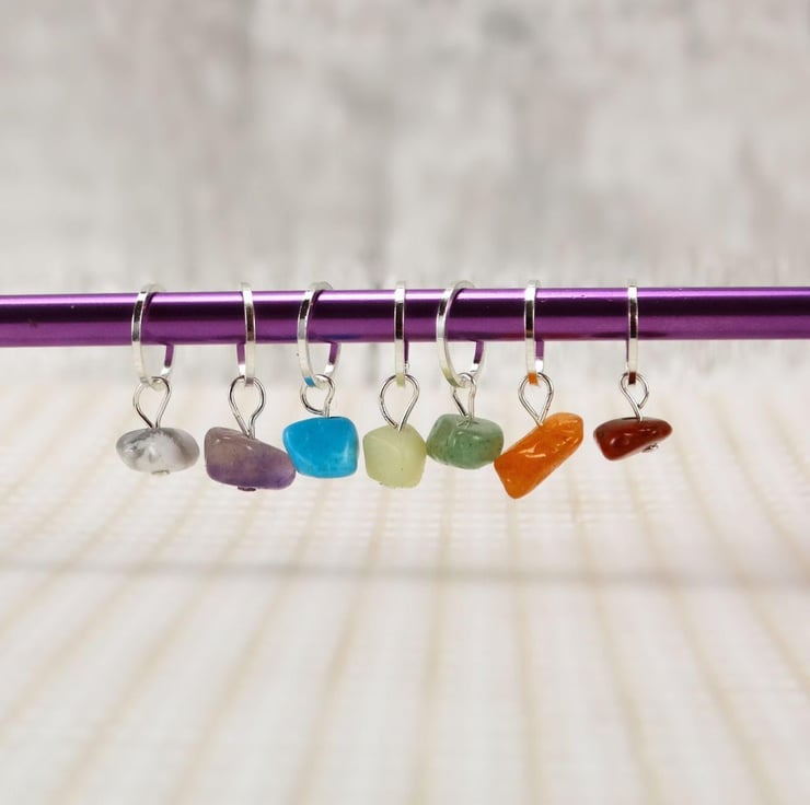 Beautiful Chakra gemstone chip stitch markers. In a mix of stones and colours as shown, however, every set is unique due to the natural Chakra gemstones used.