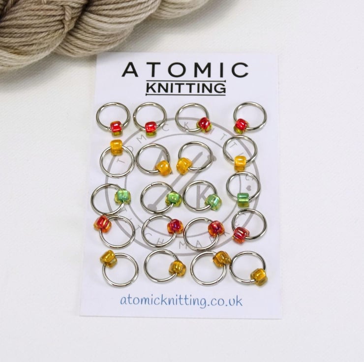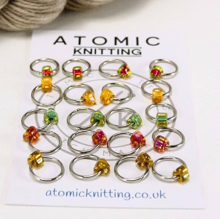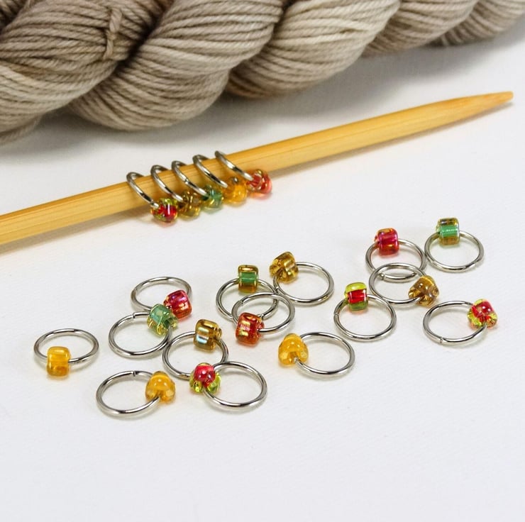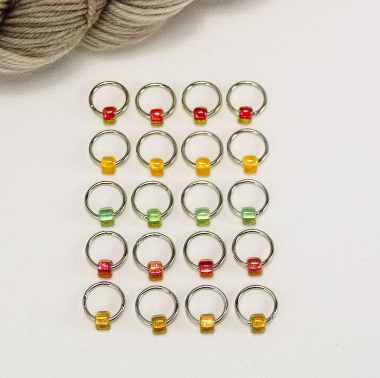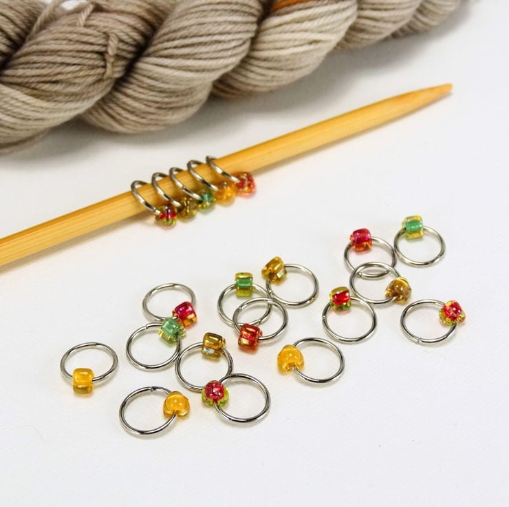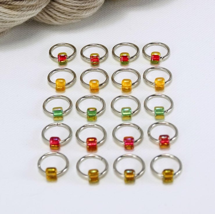 Set of 20 knitting stitch markers in a colourful selection of Japanese miyuki glass TRIANGLE beads. On stainless steel rings. Colours may vary to those shown.