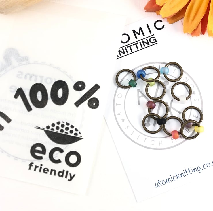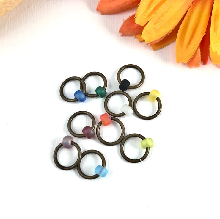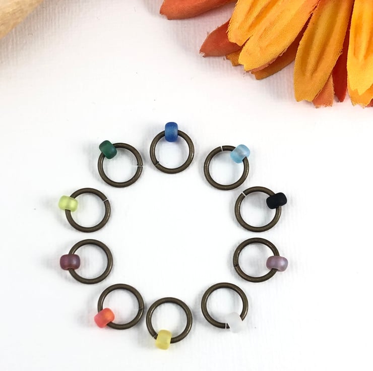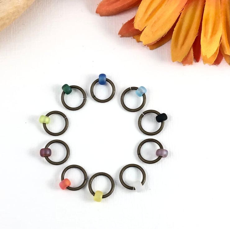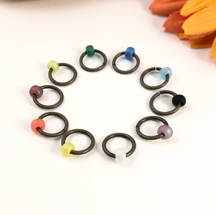 Set of 10 knitting stitch markers in a colourful rainbow mix of Japanese miyuki glass frosted round beads. On antiqued bronze rings.